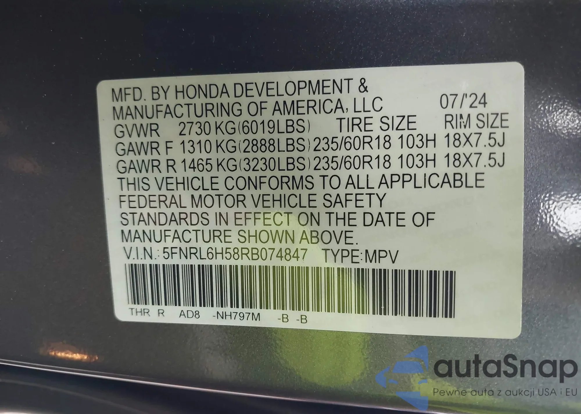• VIN 5FNRL6H58RB074847