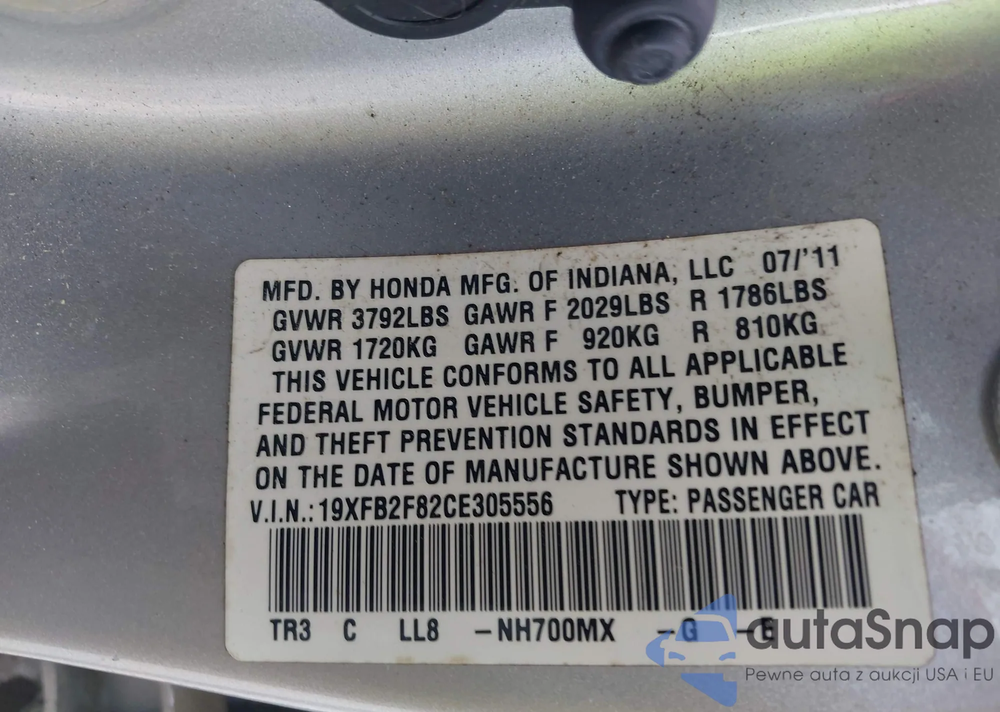 LOT: 43033845 VIN: 1HGCP26718A052267