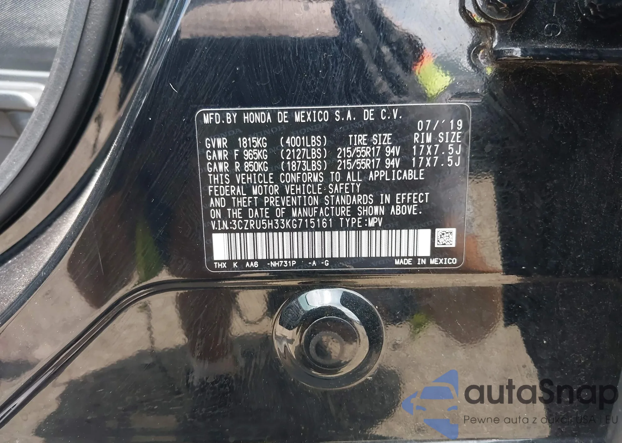 • VIN 3CZRU5H33KG715161
