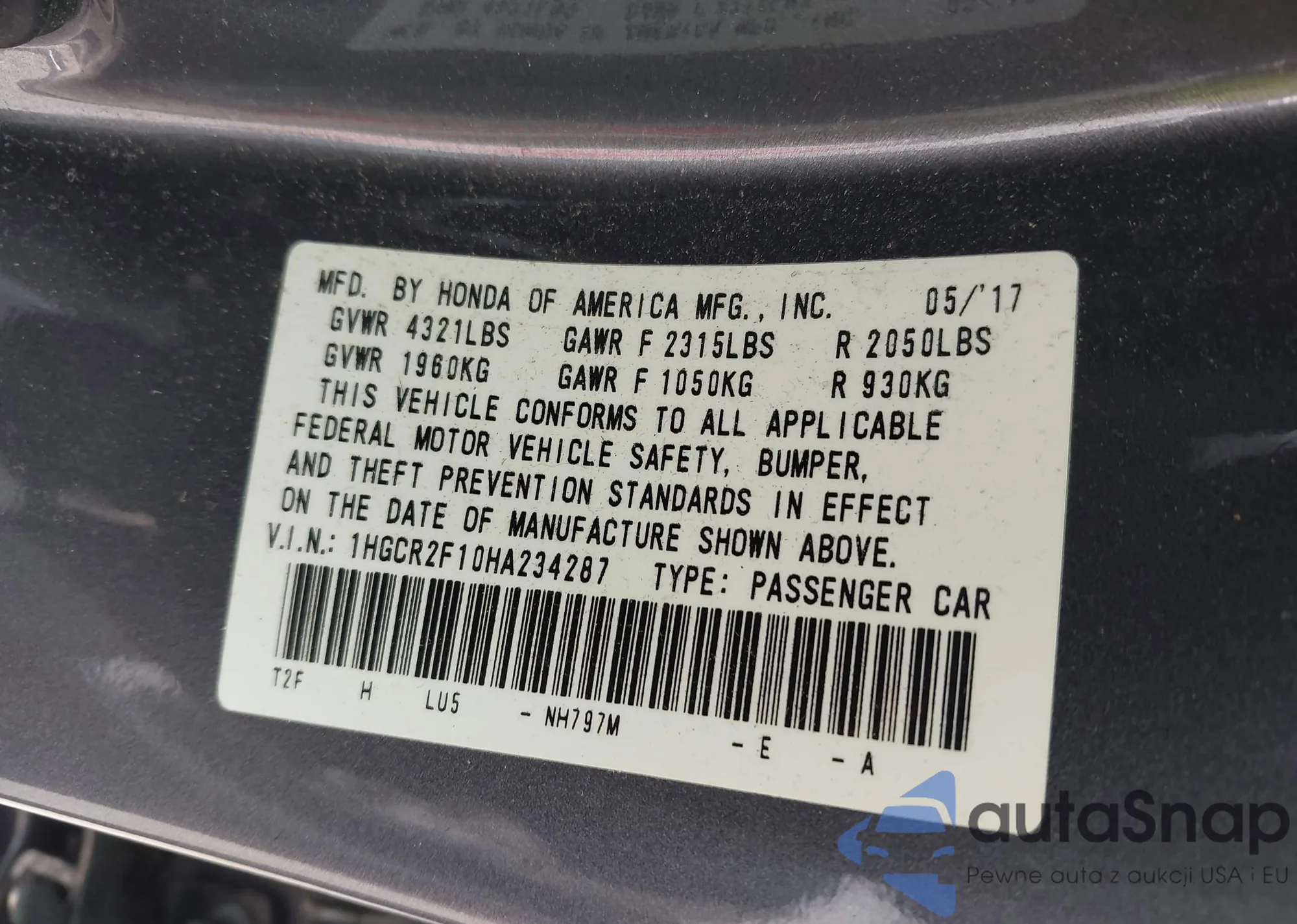 LOT: 42699112 VIN: 1HGCR2F10HA234287
