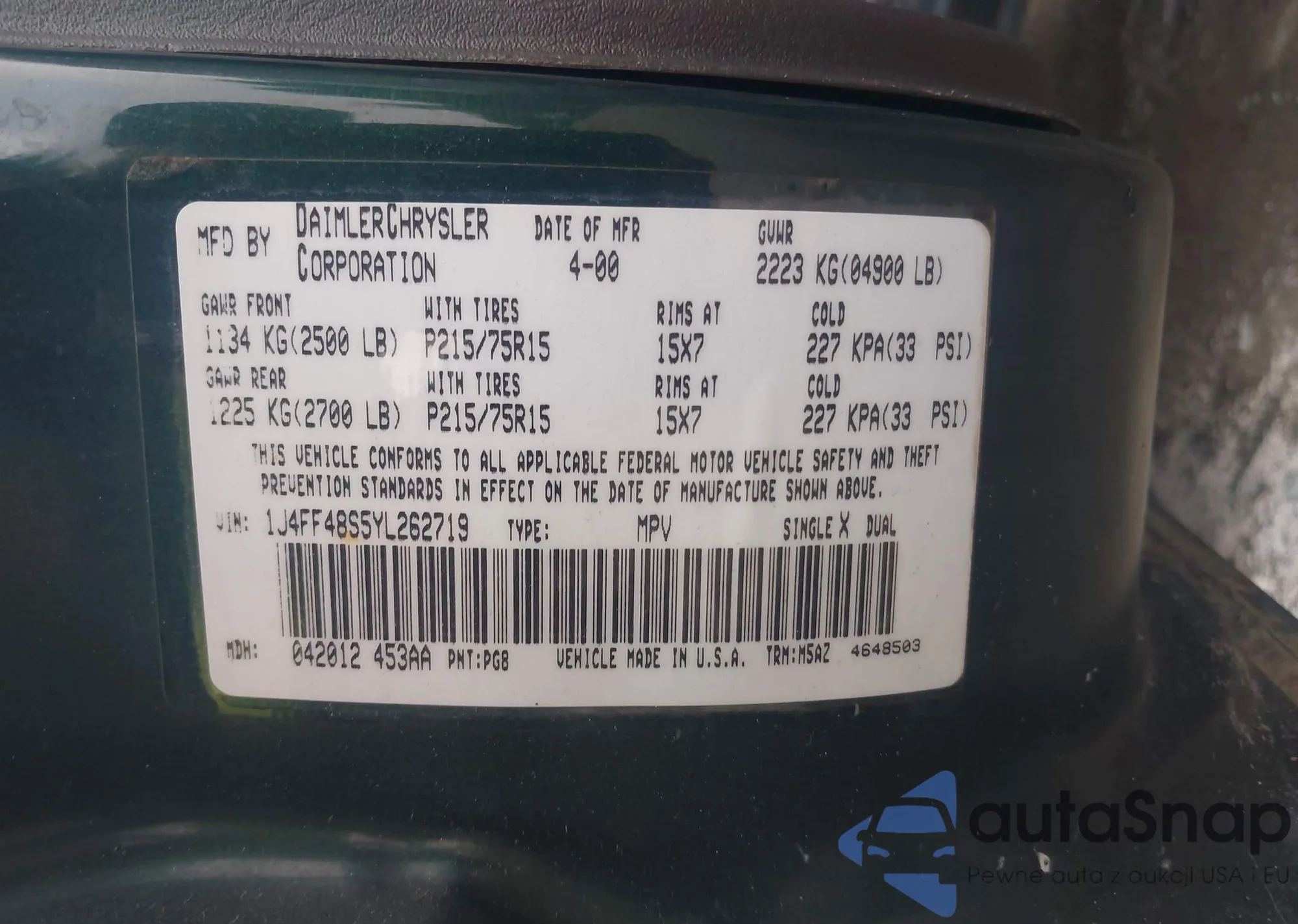 • VIN 1J4FF48S5YL262719