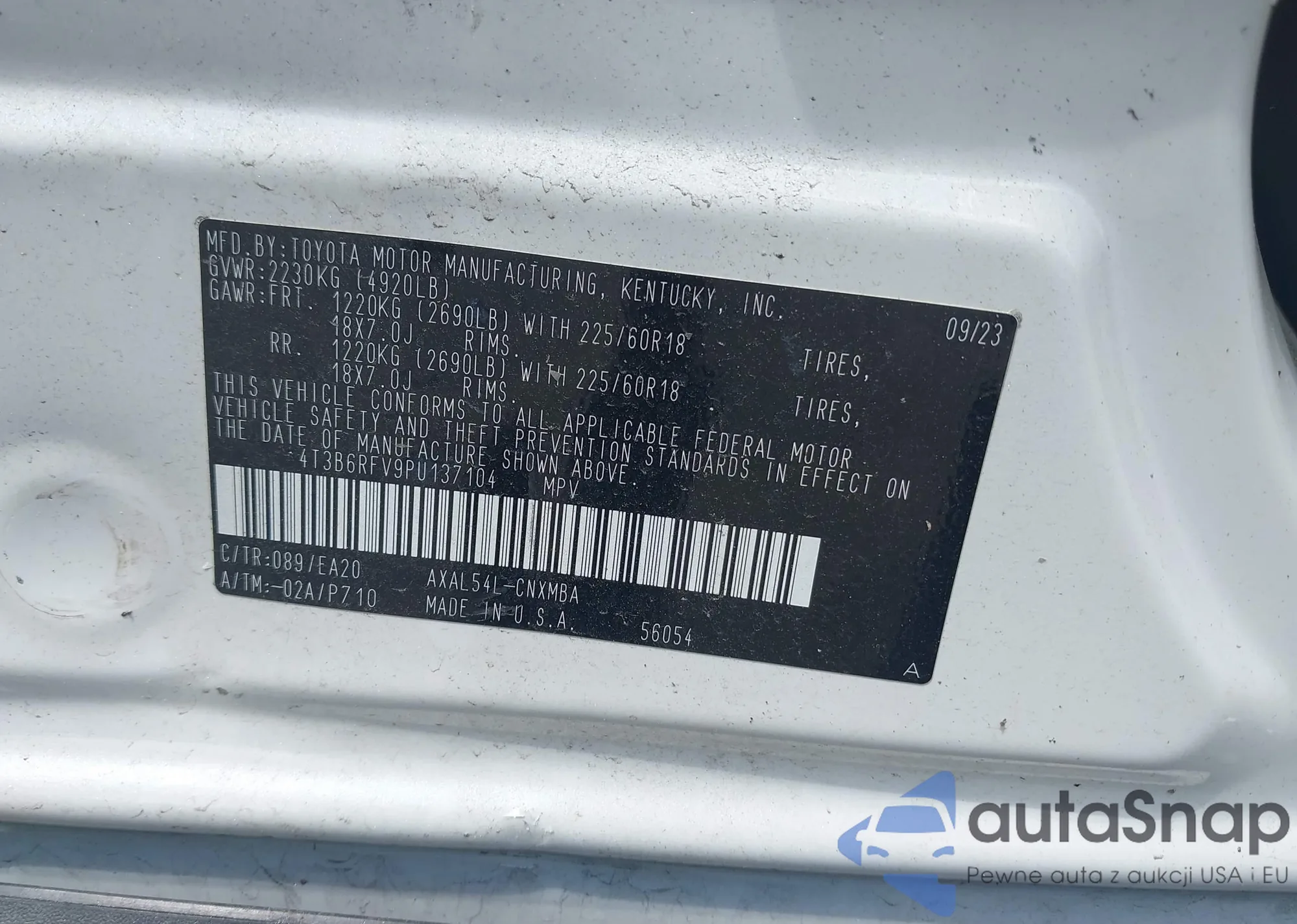 LOT: 42549880 VIN: 4T3B6RFV9PU137104