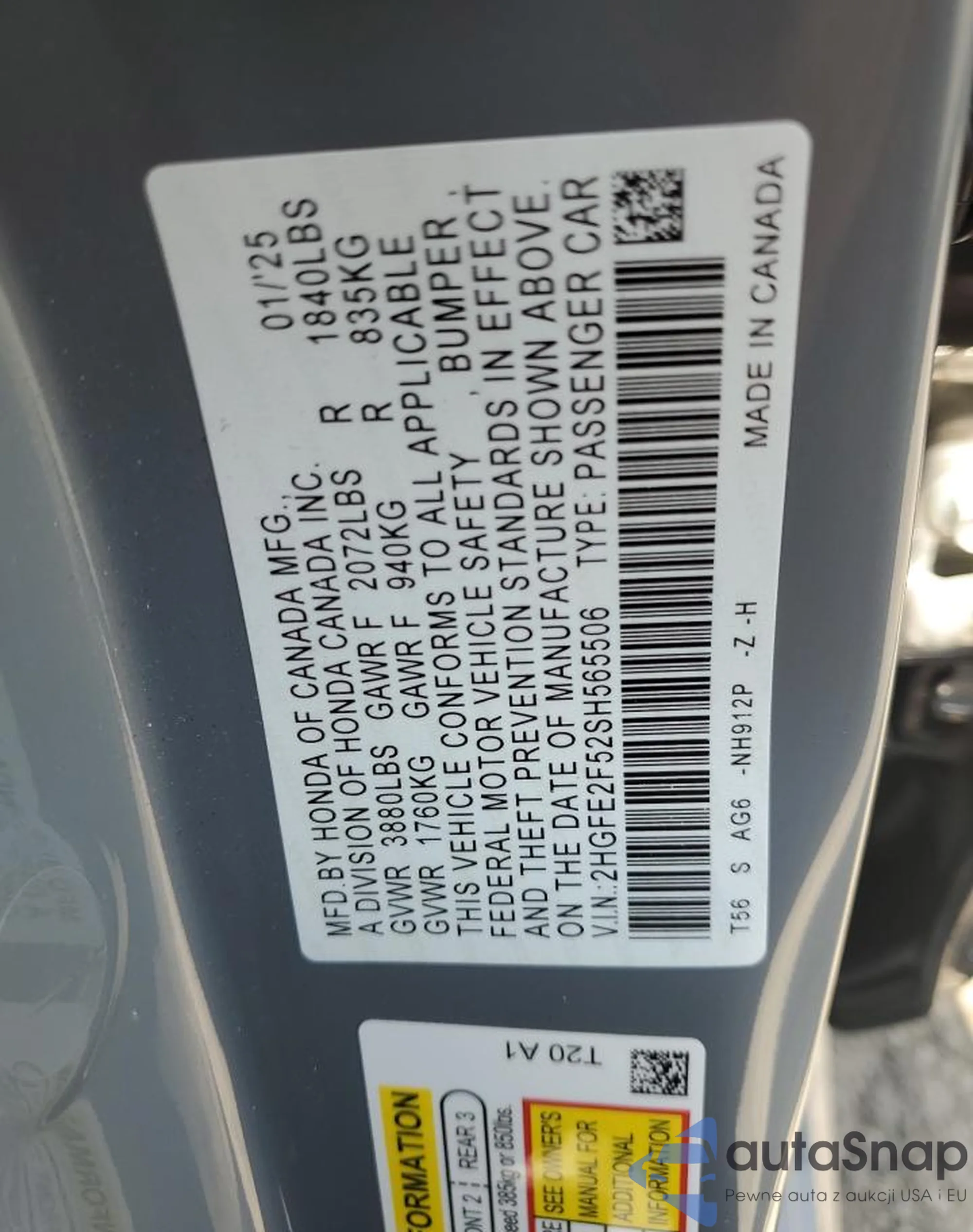 LOT: 60749185 VIN: 2HGFE2F52SH565506
