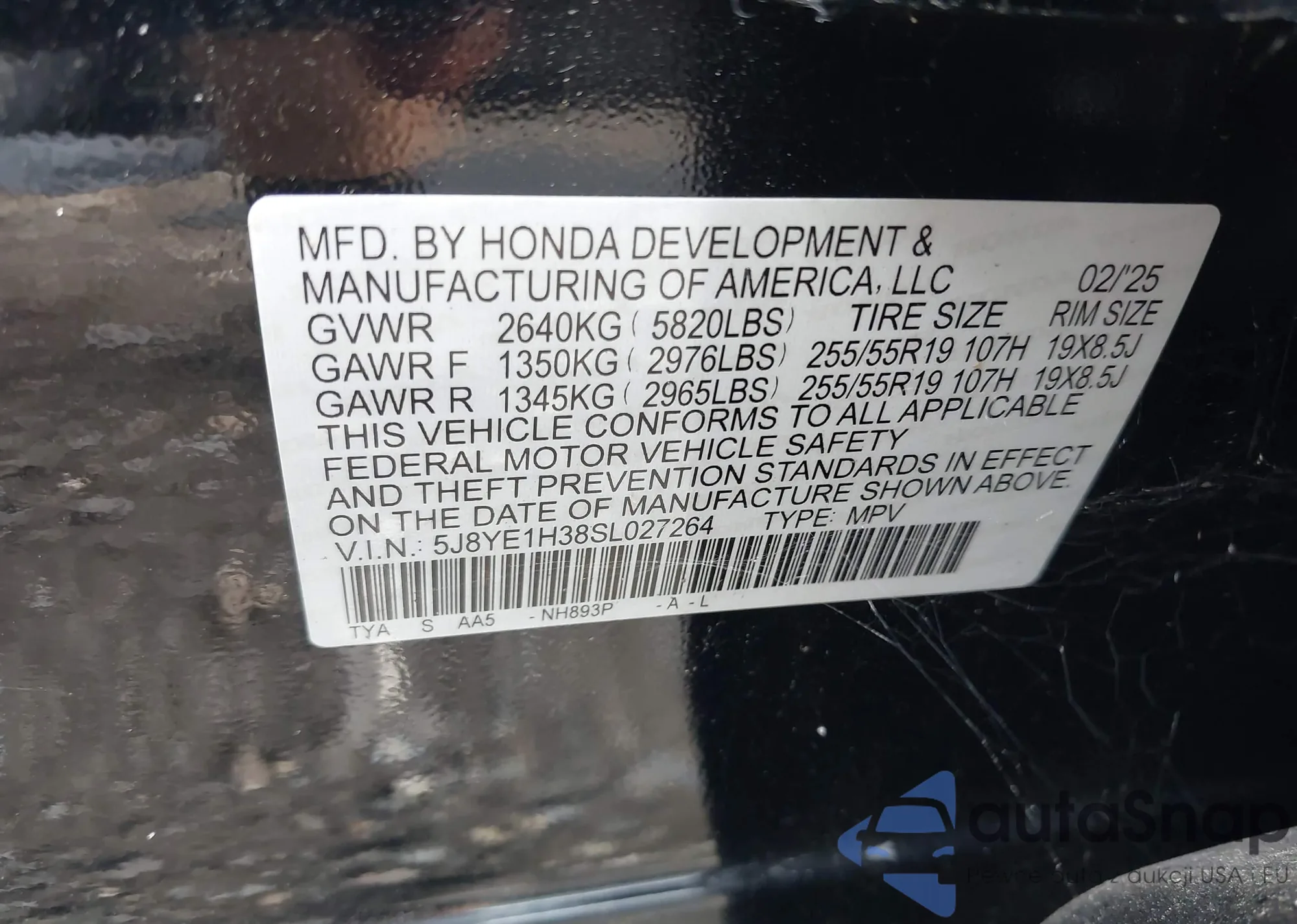 • VIN 5J8YE1H38SL027264
