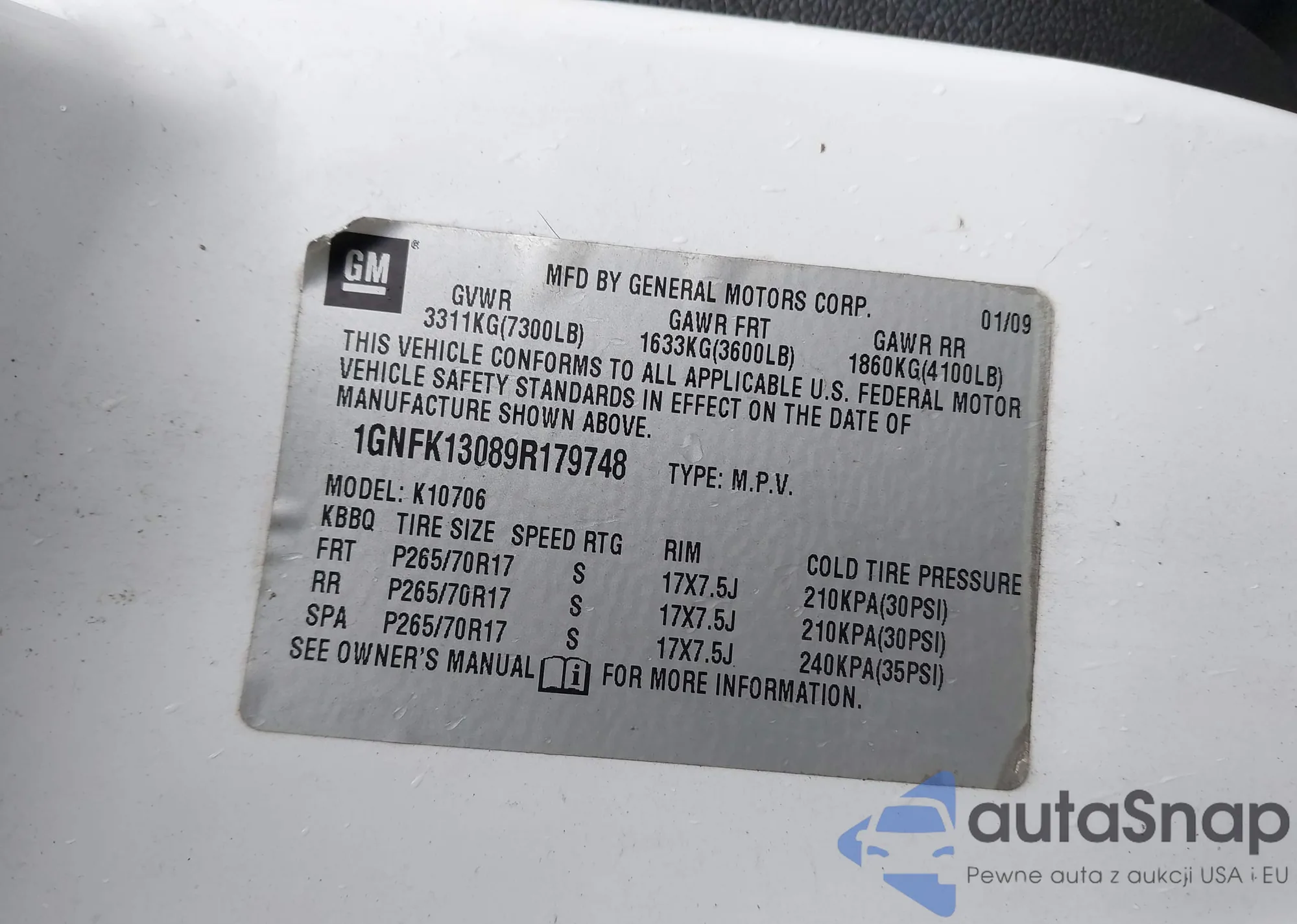 LOT: 42850138 VIN: 1GNFK13089R179748