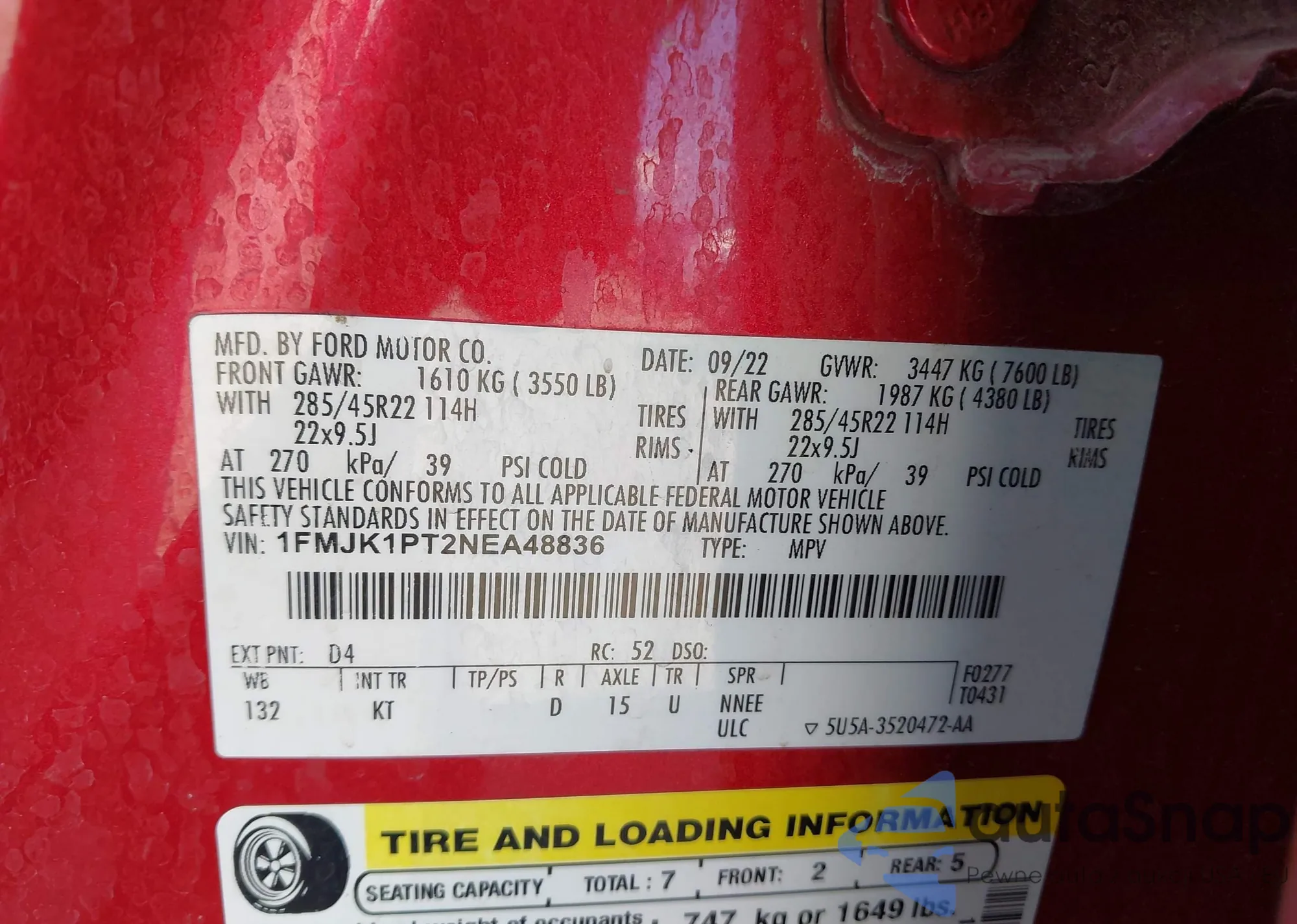 LOT: 42920884 VIN: 1FMJK1PT2NEA48836