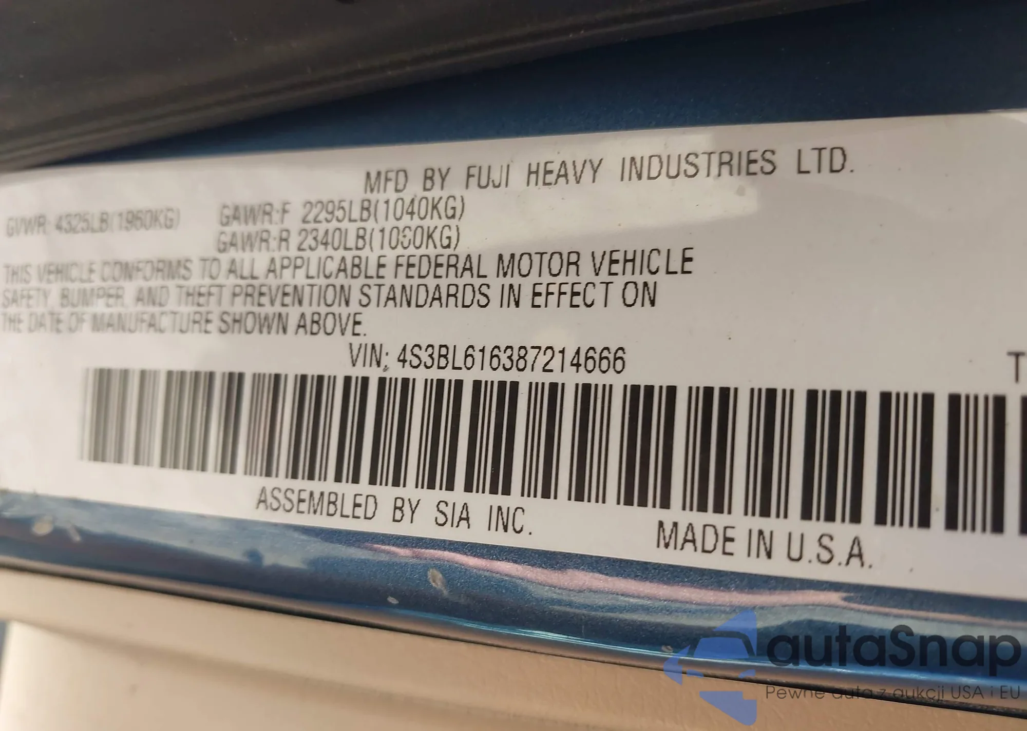 • VIN 4S3BL616387214666