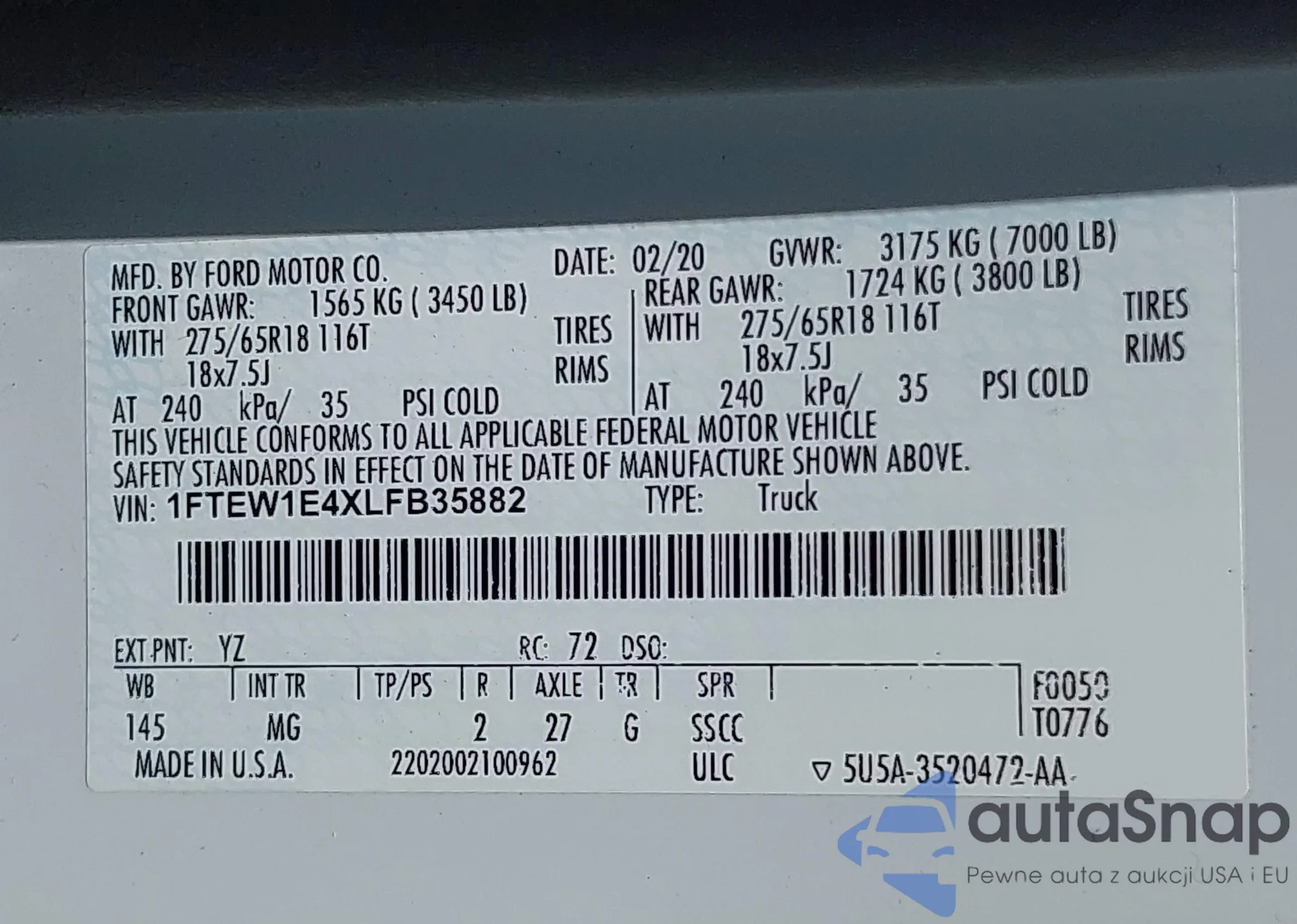 LOT: 42694170 VIN: 1FTEW1E4XLFB35882