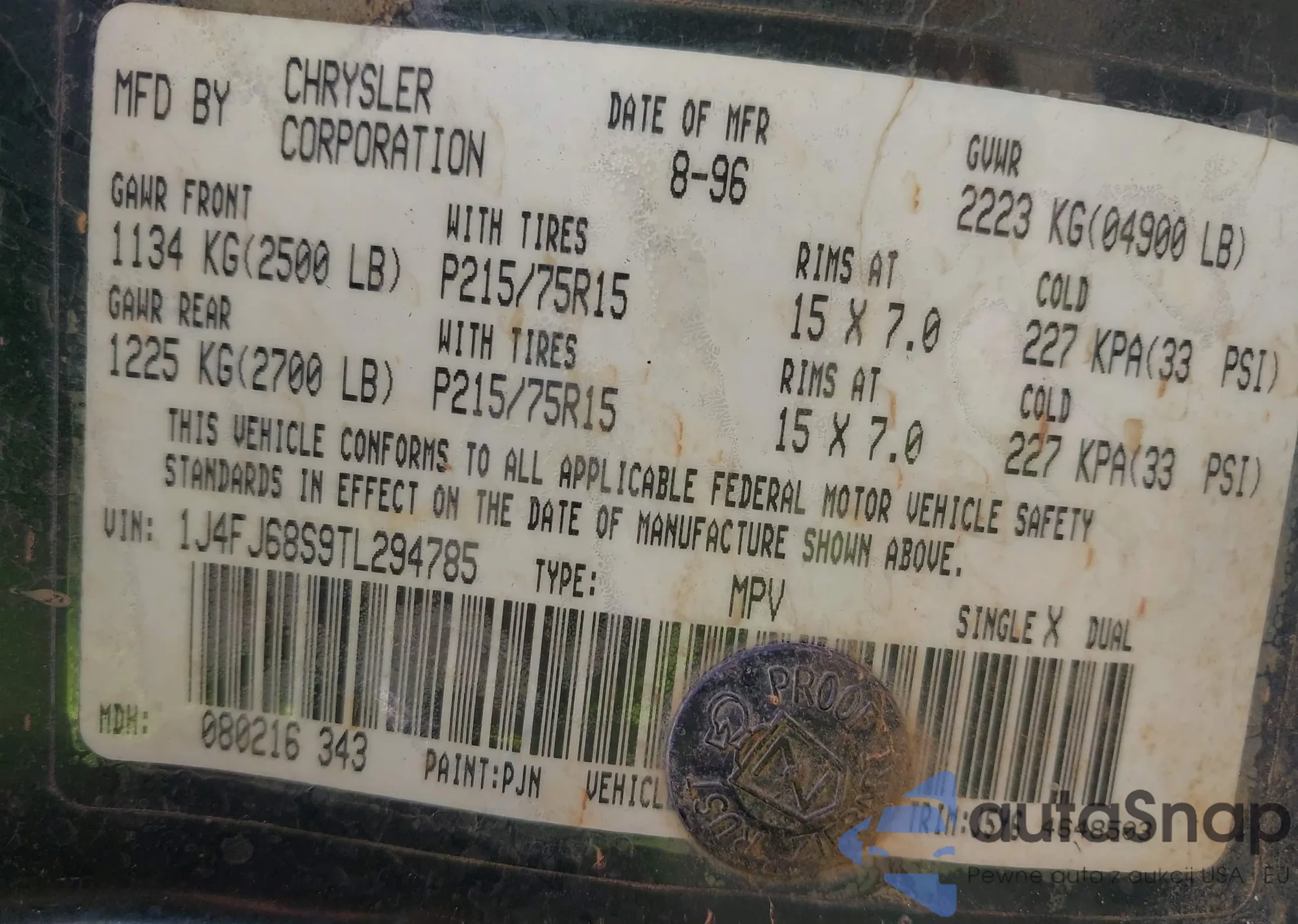 • VIN 1J4FJ68S9TL294785