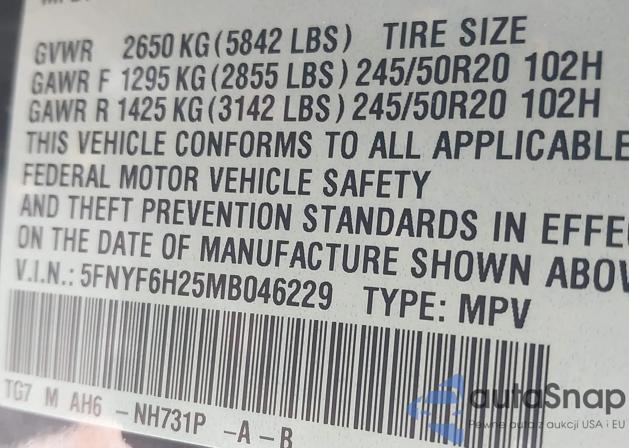 LOT: 42818287 VIN: 5FNYF3H99FB016035