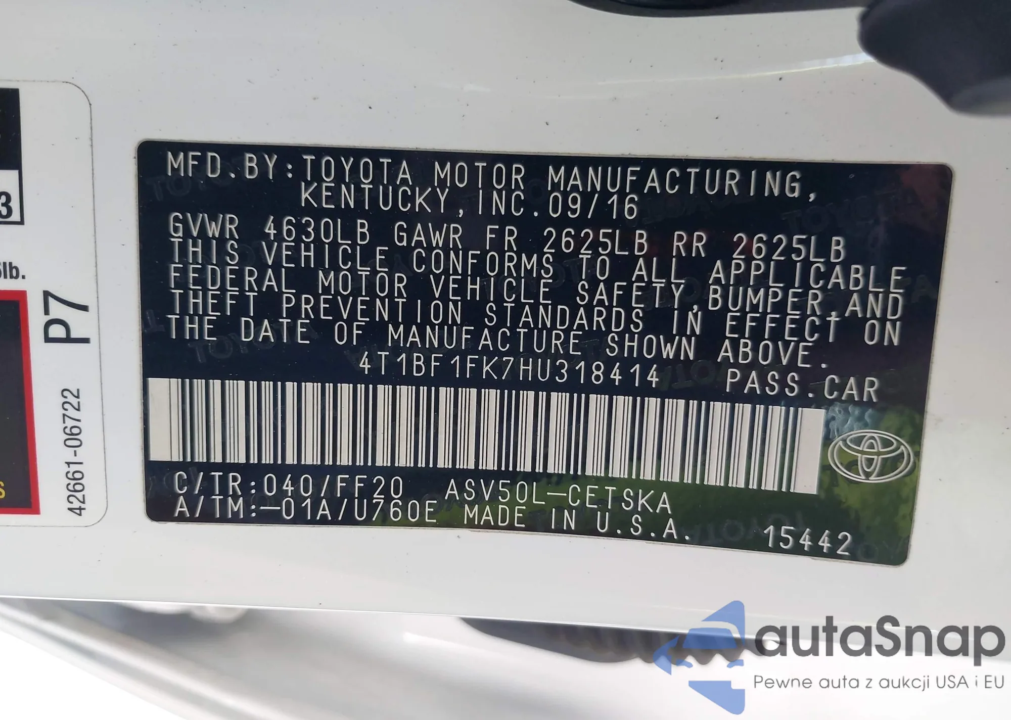 • VIN 4T1BF1FK7HU318414