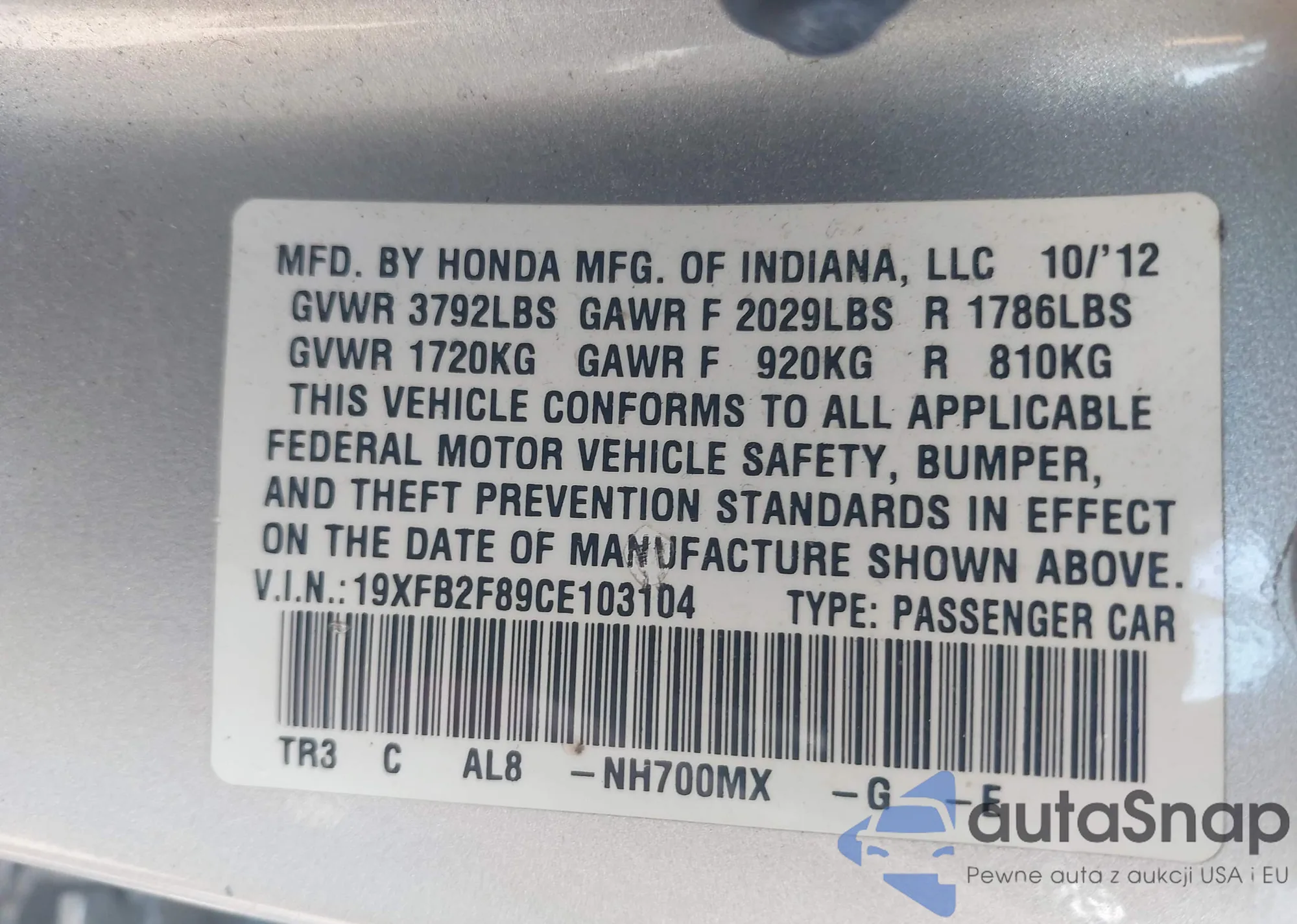 LOT: 42757599 VIN: 2HNYD2H30CH521893