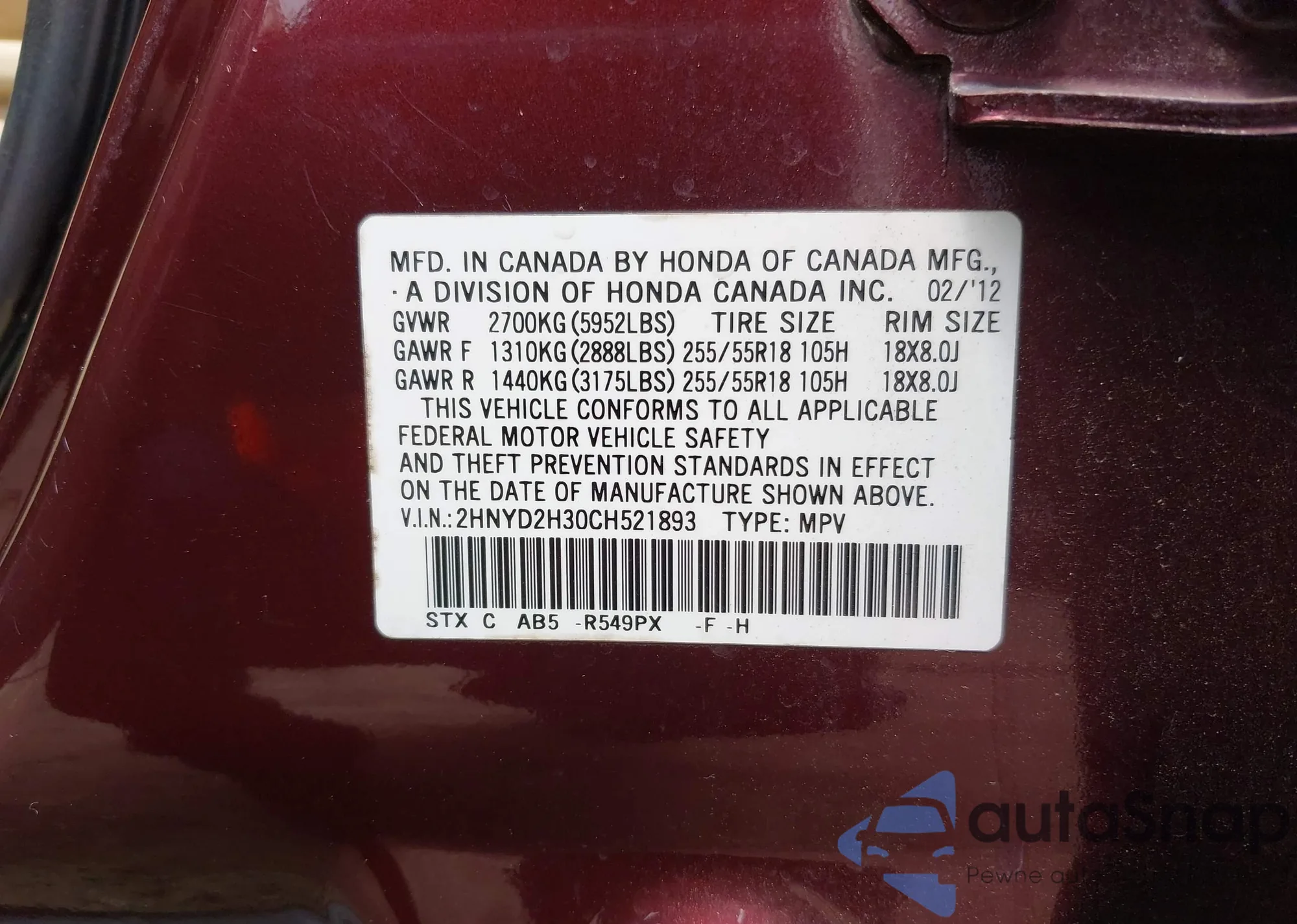 • VIN 2HNYD2H30CH521893
