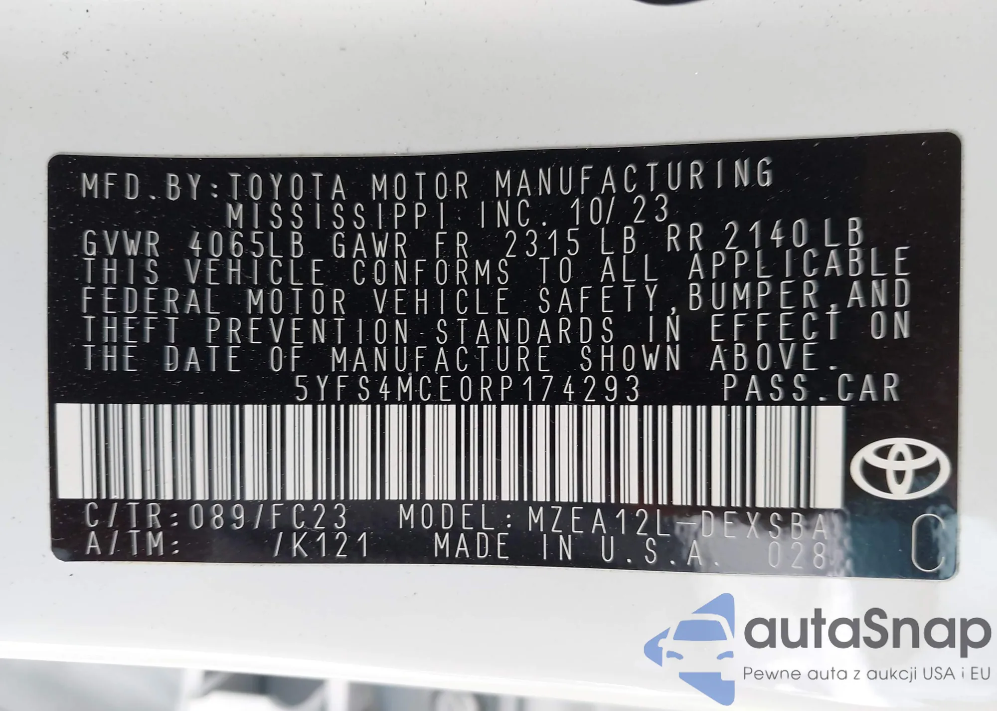 LOT: 42312538 VIN: 5YFS4MCE0RP174293