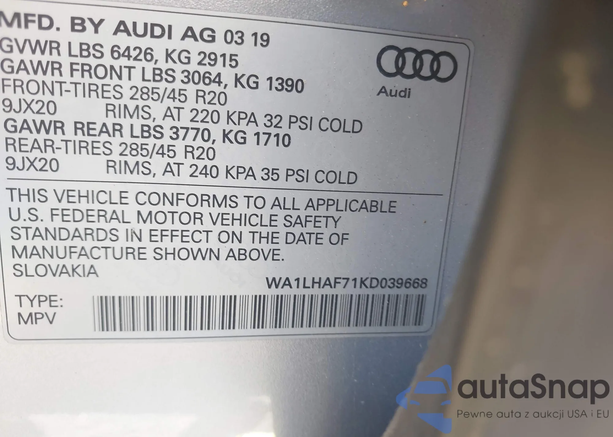 LOT: 42489805 VIN: WA1LHAF71KD039668