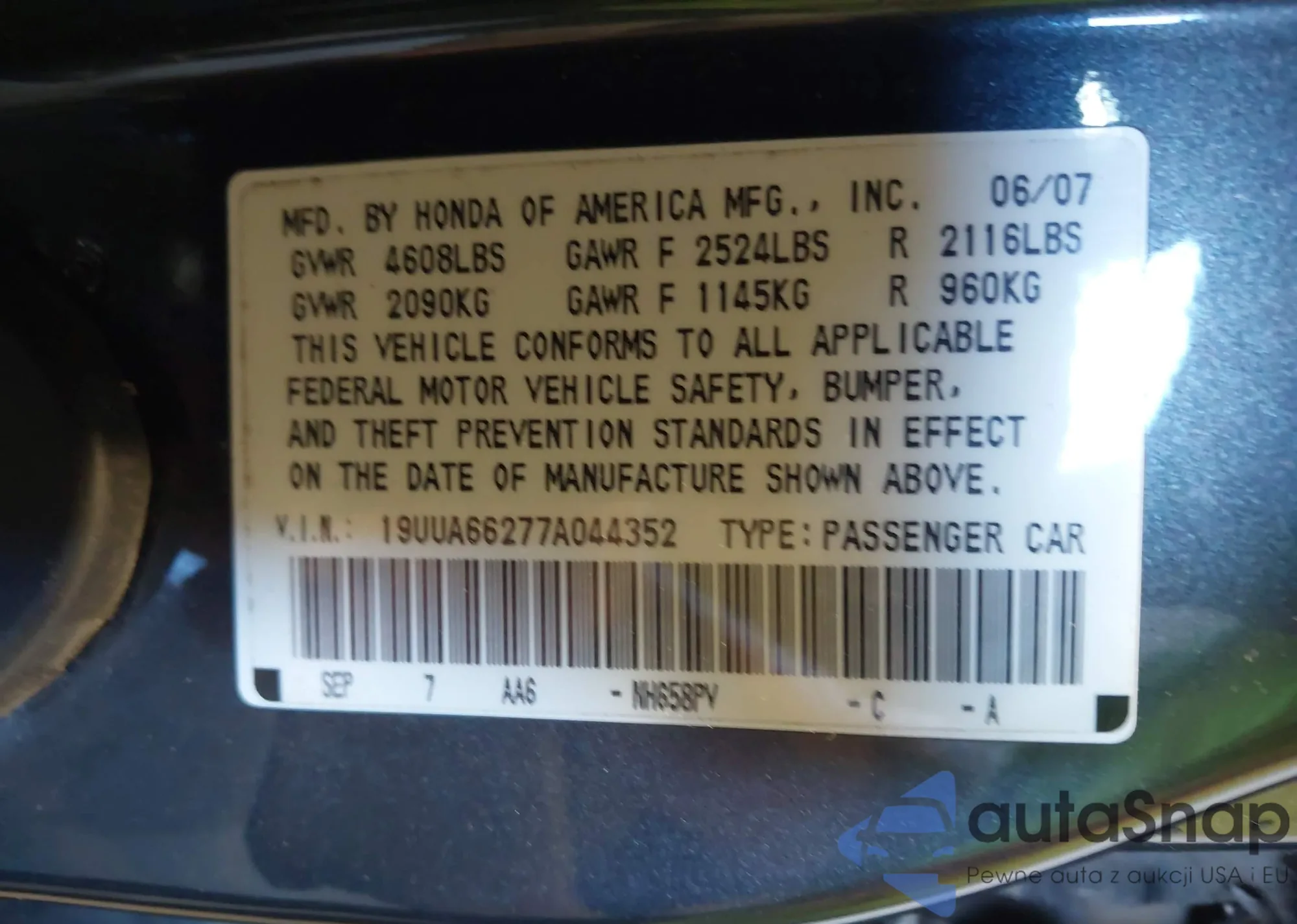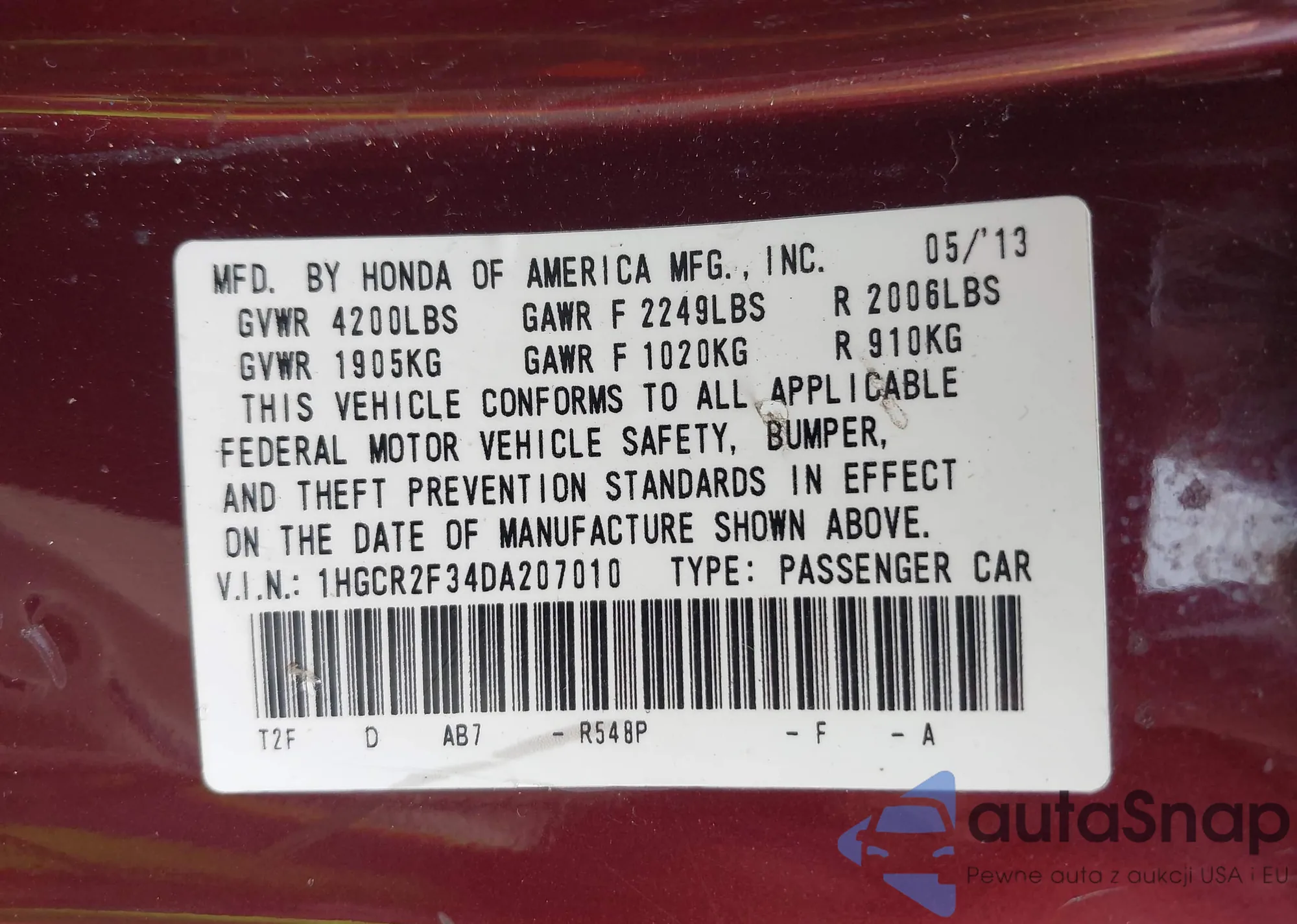 LOT: 42716405 VIN: 1HGCR2F34DA207010