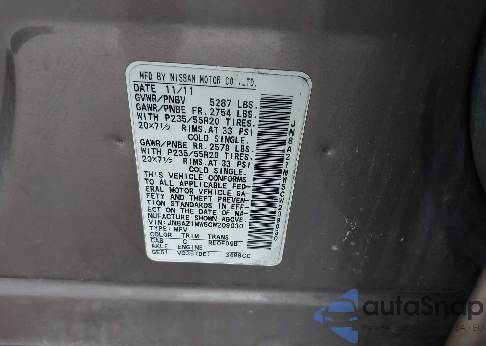 • VIN JN8AZ1MW5CW209030