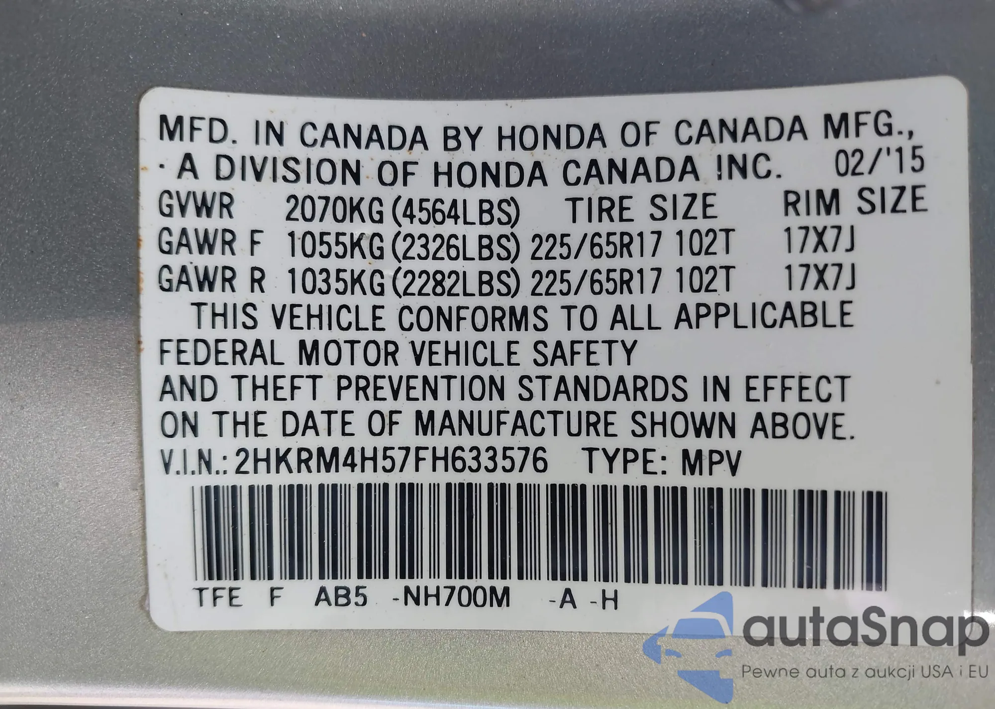 • VIN 2HKRM4H57FH633576