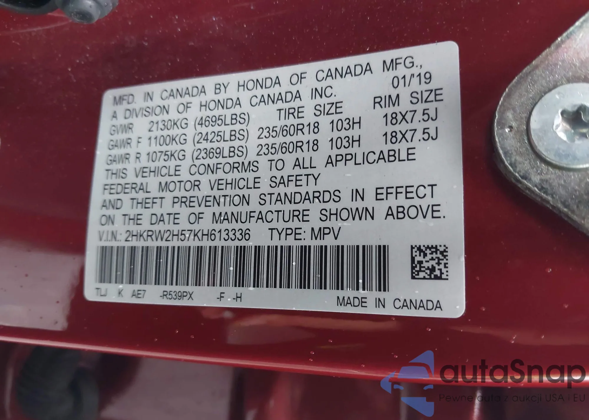 • VIN 2HKRW2H57KH613336