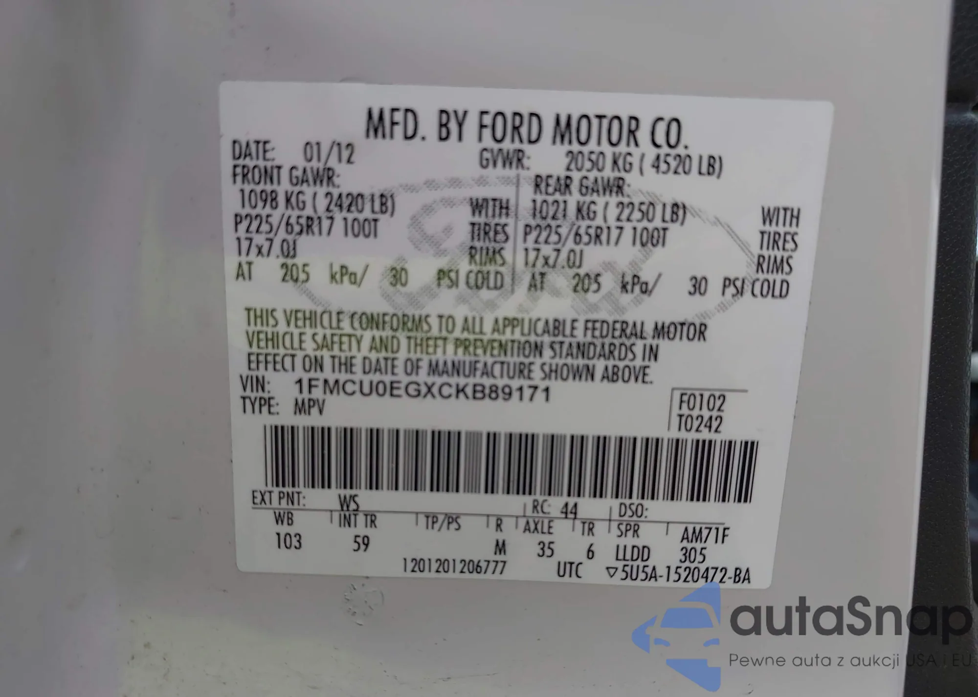 • VIN 1FMCU0EGXCKB89171