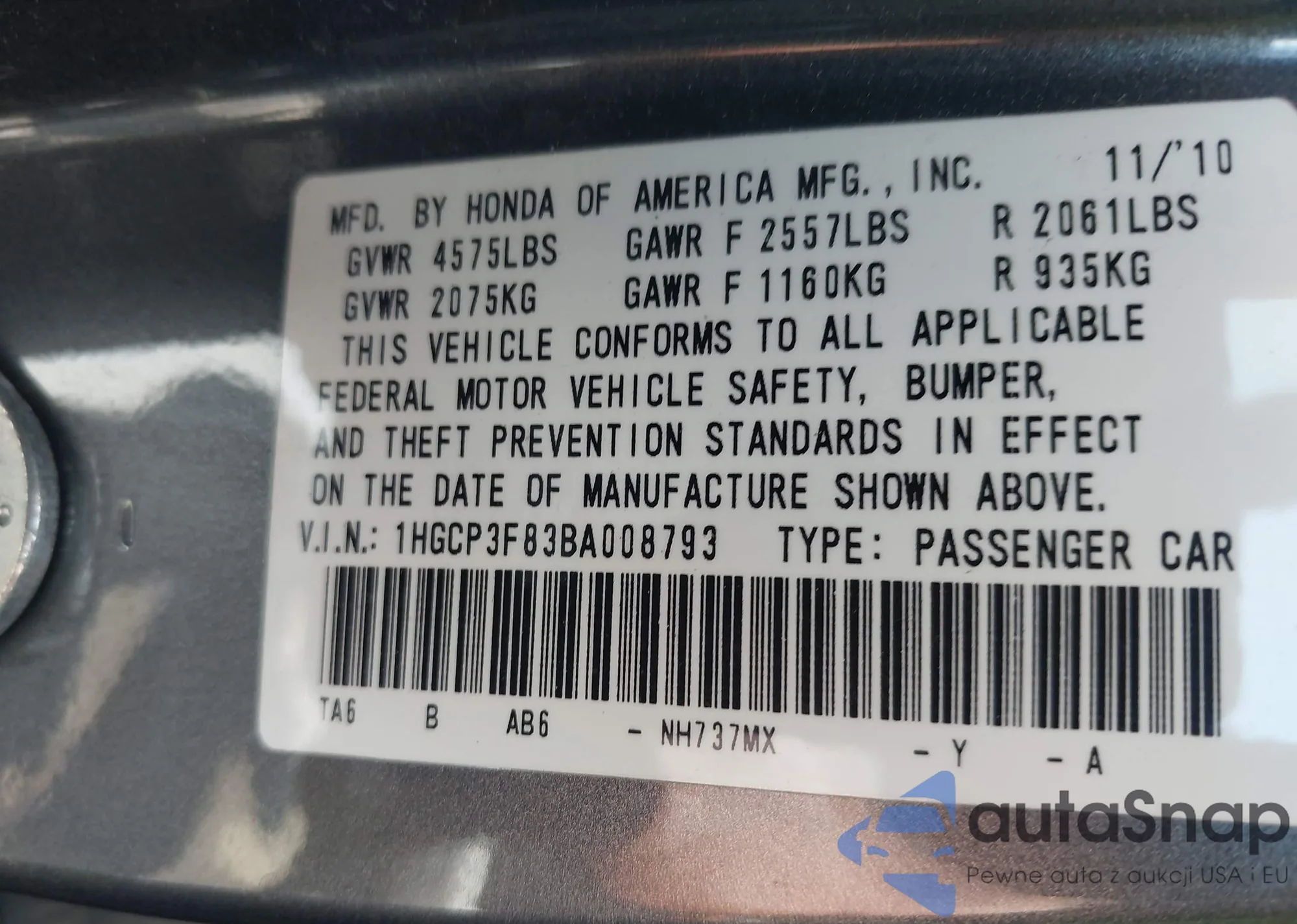 LOT: 42767482 VIN: 1HGCP3F83BA008793