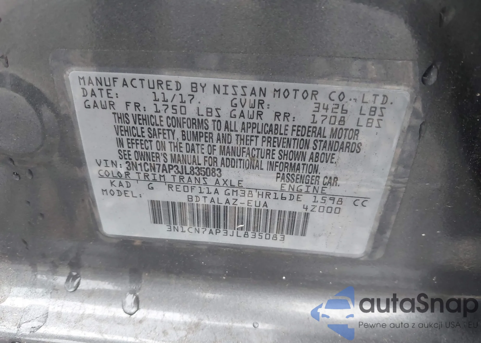 LOT: 42309174 VIN: 3N1CN7AP3JL835083