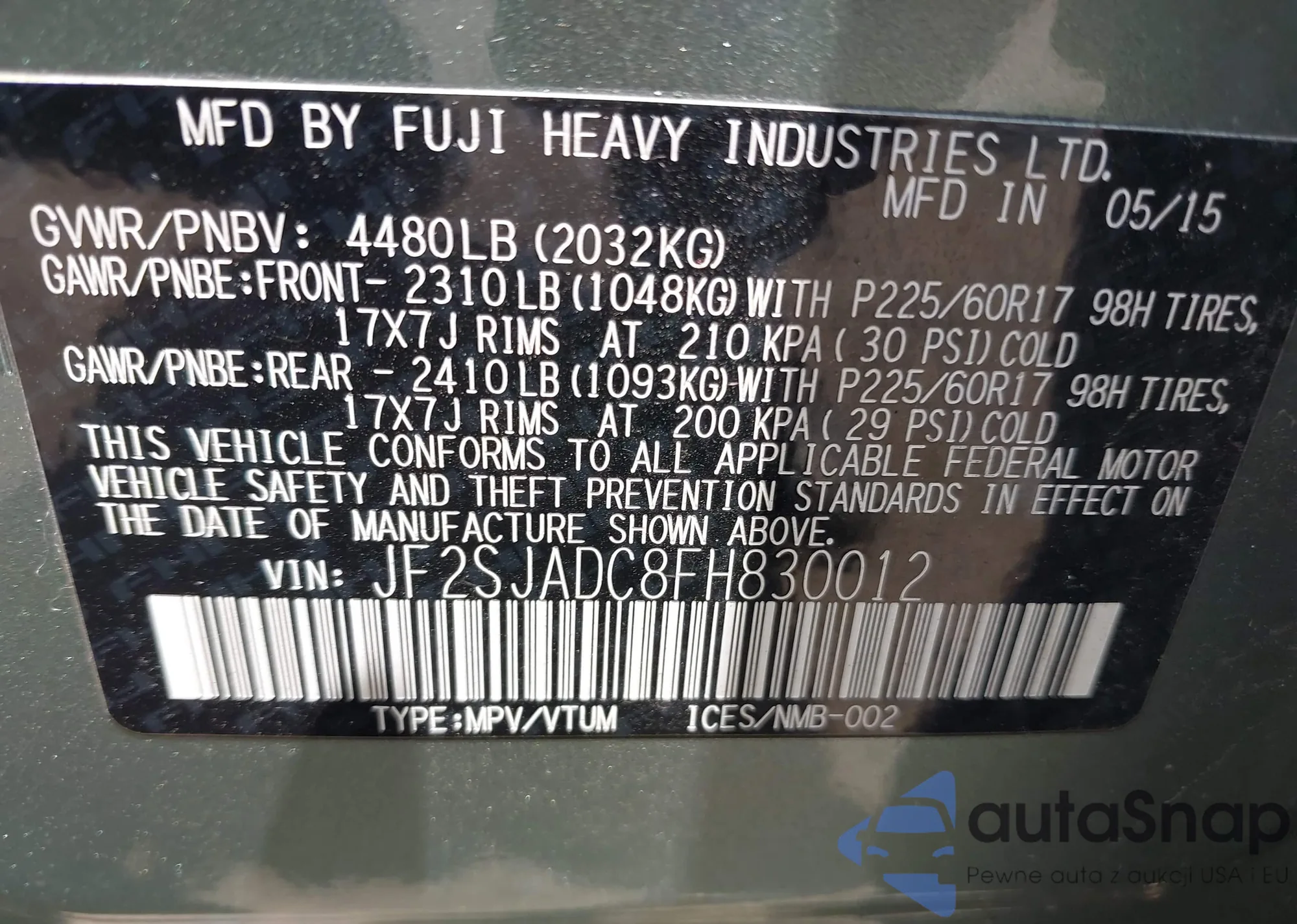 LOT: 42826374 VIN: JF2SJADC8FH830012