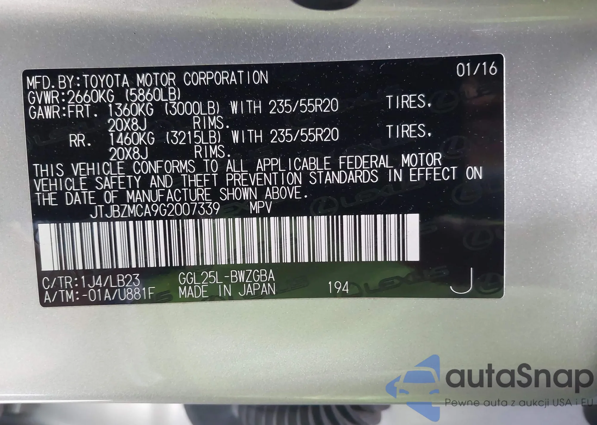 LOT: 42565897 VIN: JTJBZMCA9G2007339