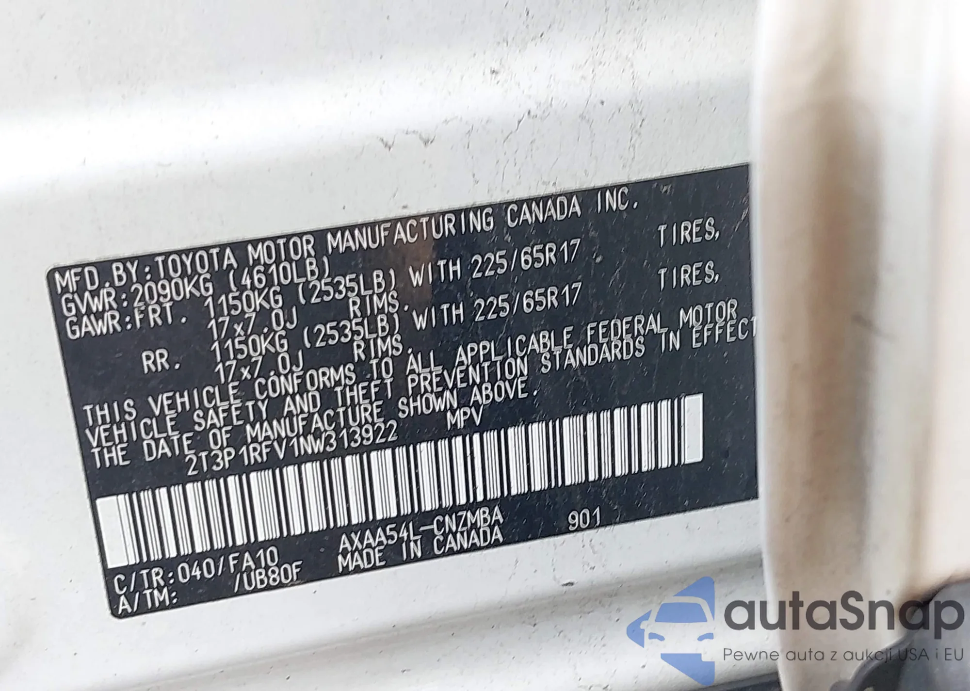 LOT: 42662112 VIN: 2T3P1RFV1NW313922