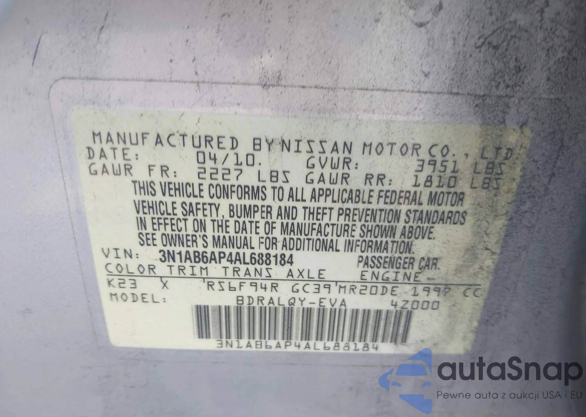 LOT: 42903227 VIN: 3N1AB6AP4AL688184