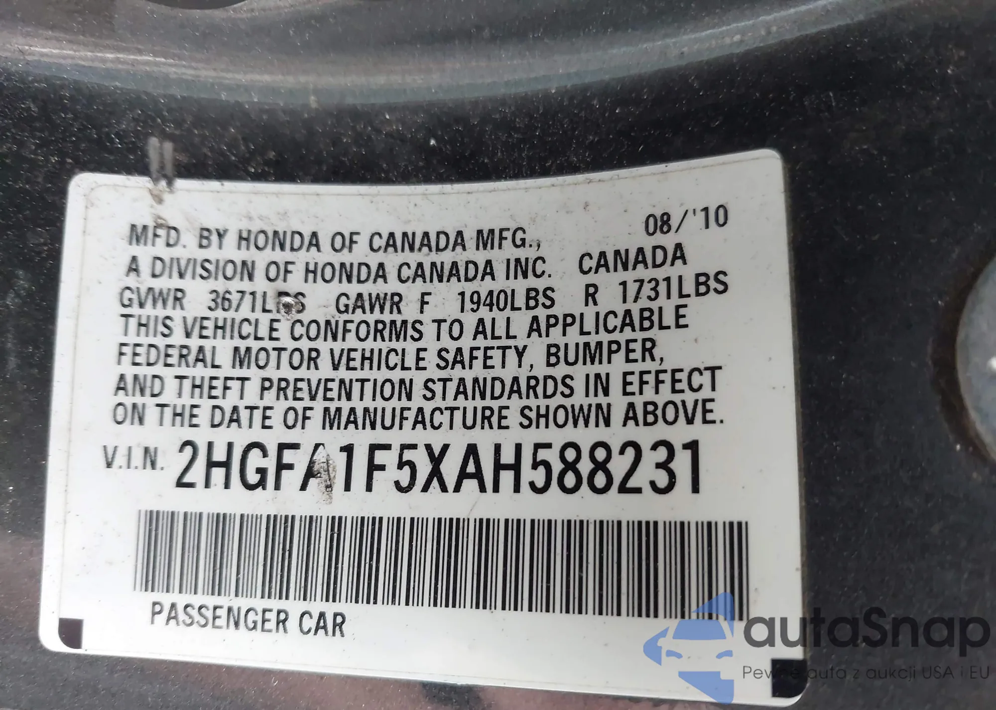• VIN 2HGFA1F5XAH588231
