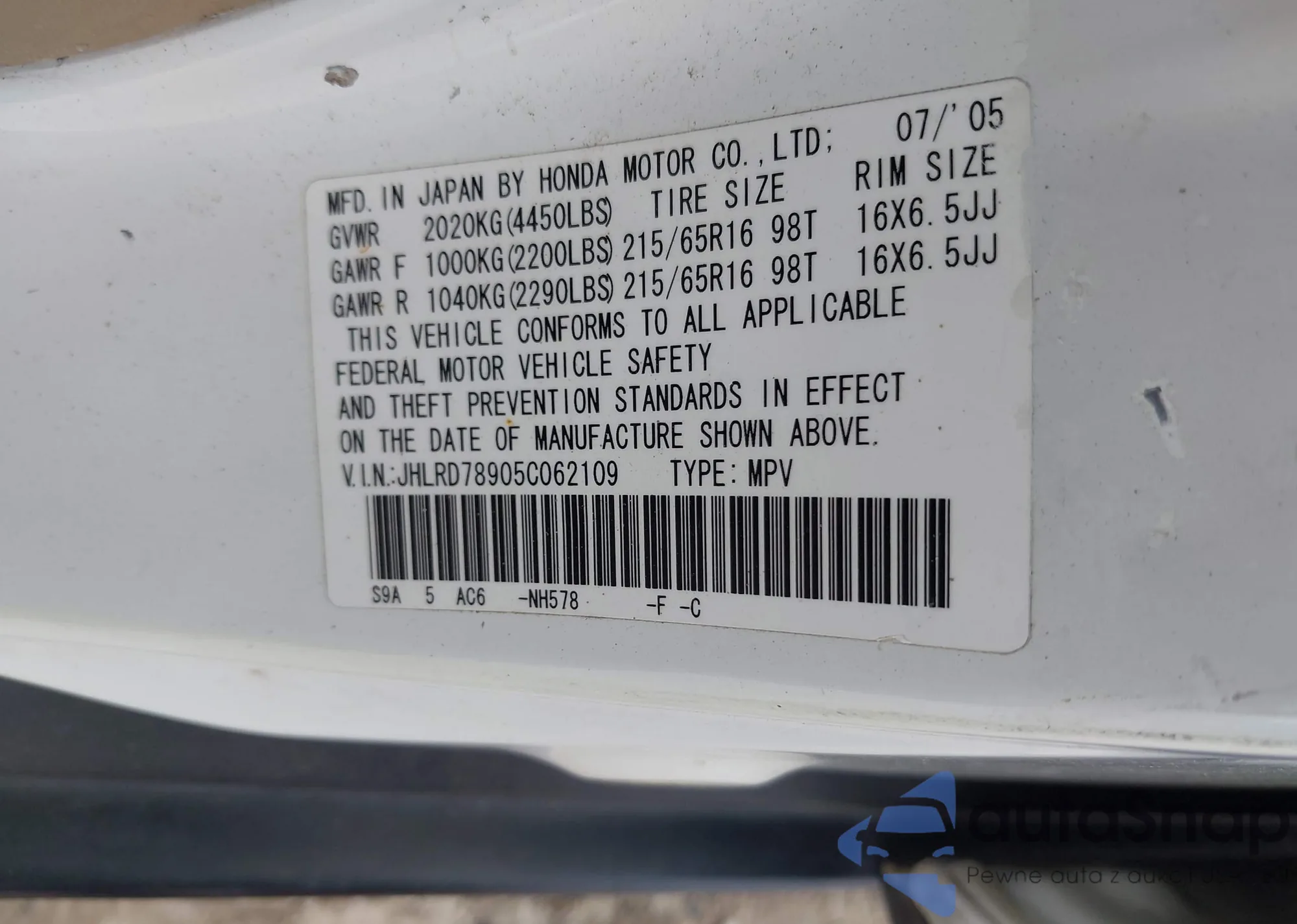 LOT: 42751322 VIN: JHLRD78905C062109