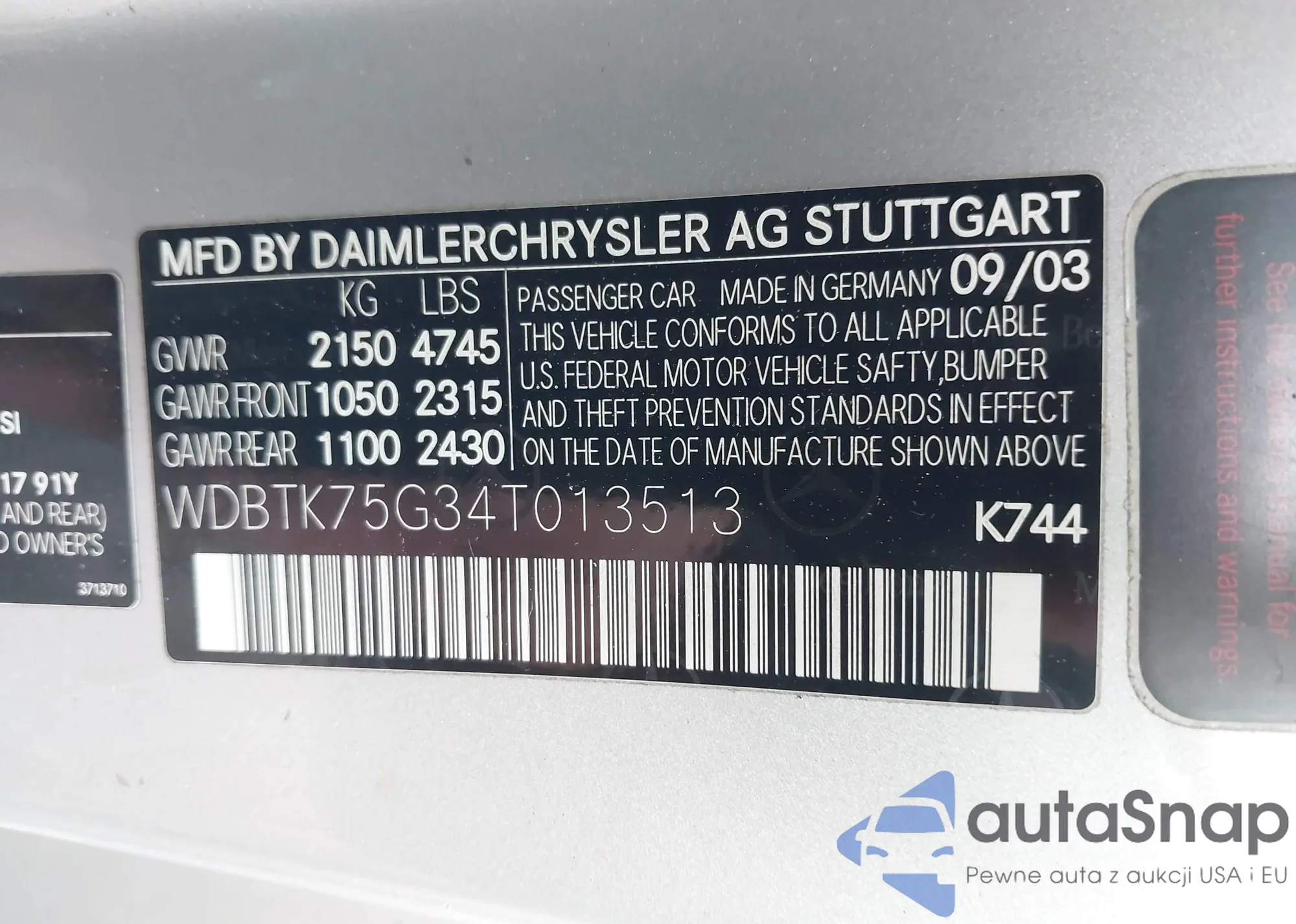 LOT: 41934478 VIN: WDBTK75G34T013513