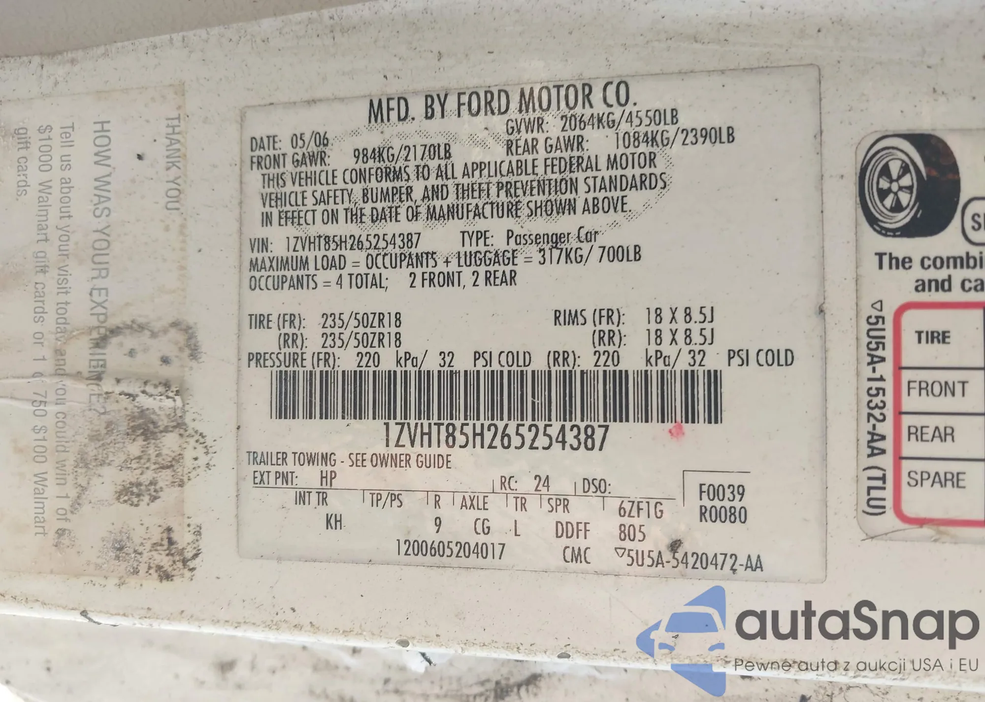 • VIN 1ZVHT85H265254387