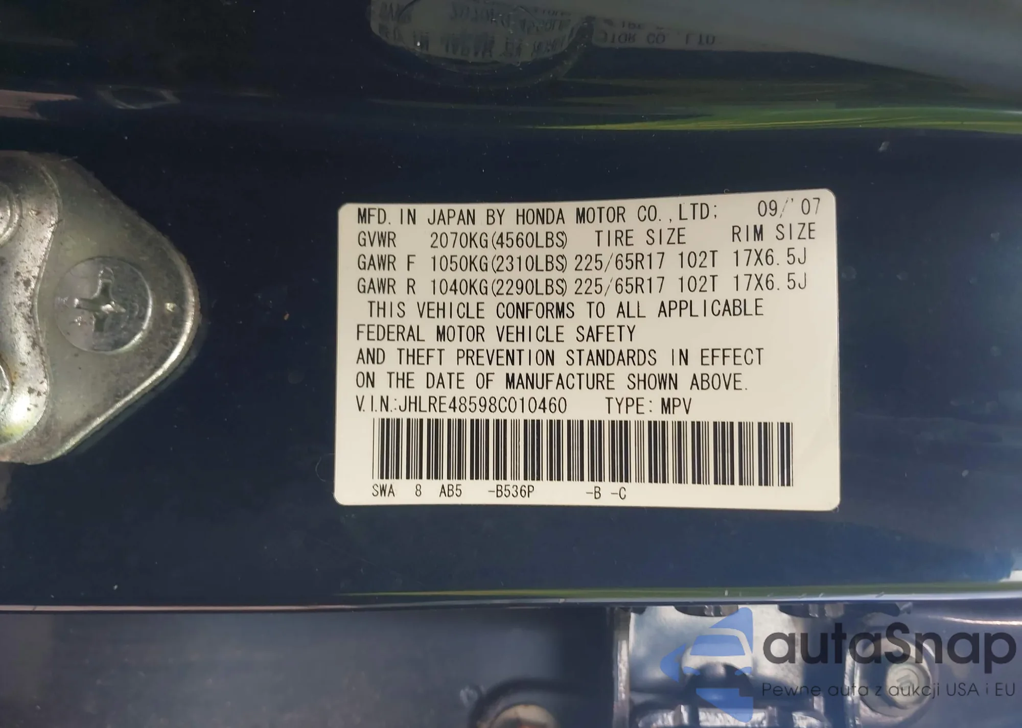 LOT: 42995621 VIN: JHLRE48598C010460