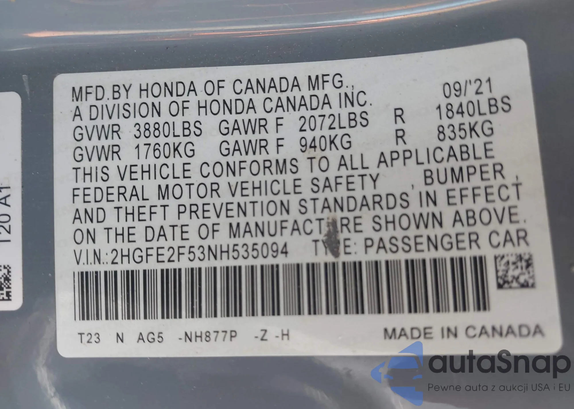 LOT: 42813589 VIN: 1HGCM66587A030697
