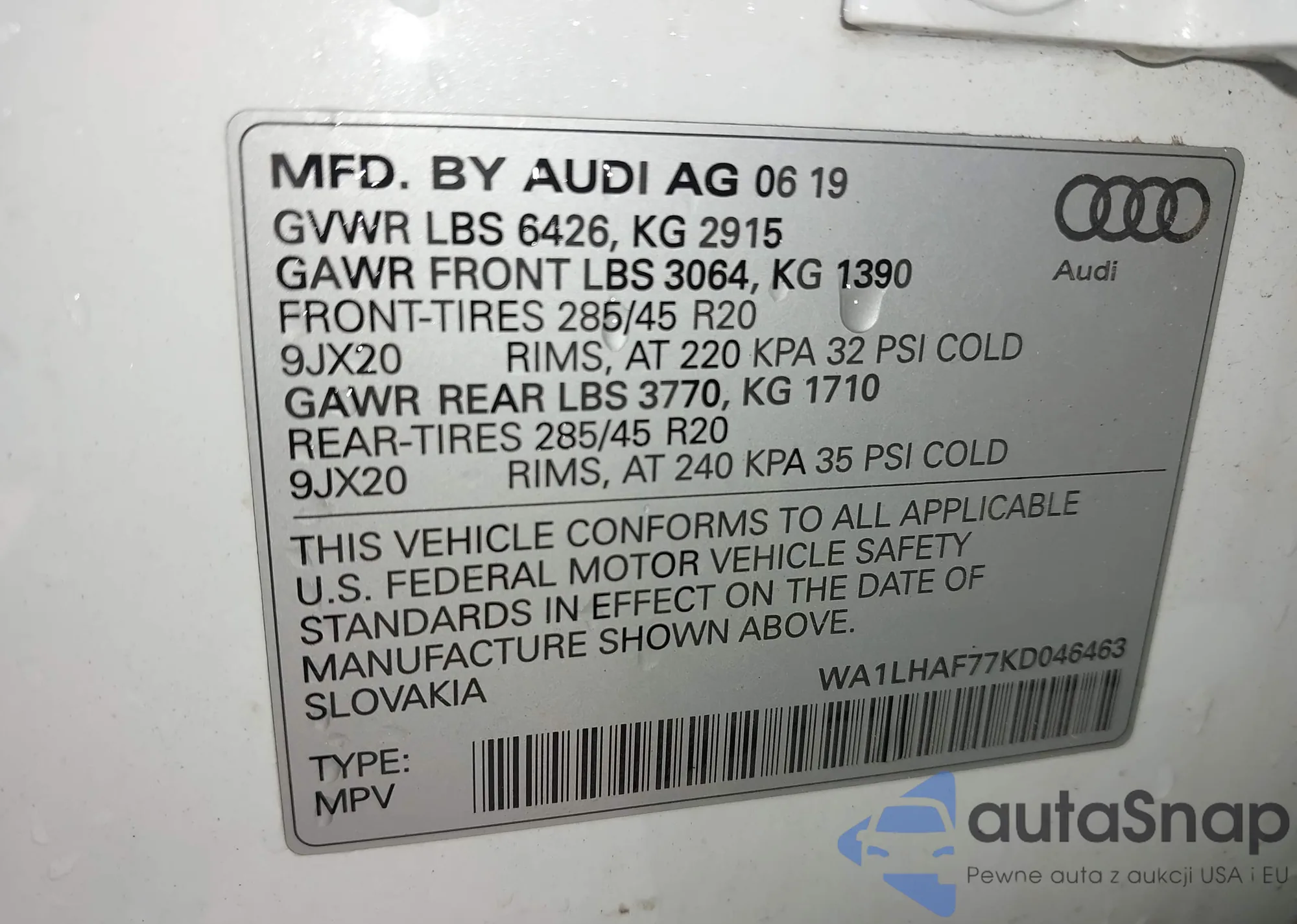 LOT: 42665104 VIN: WA1LHAF77KD046463