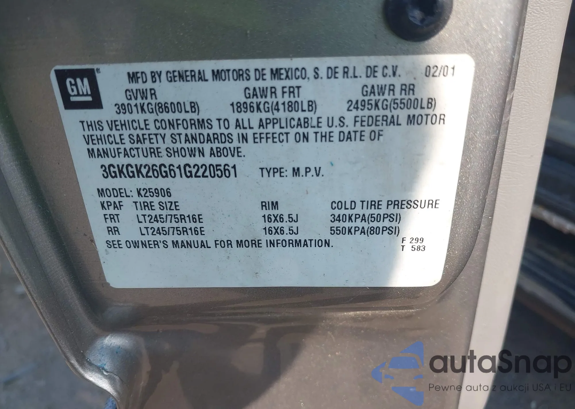 • VIN 3GKGK26G61G220561