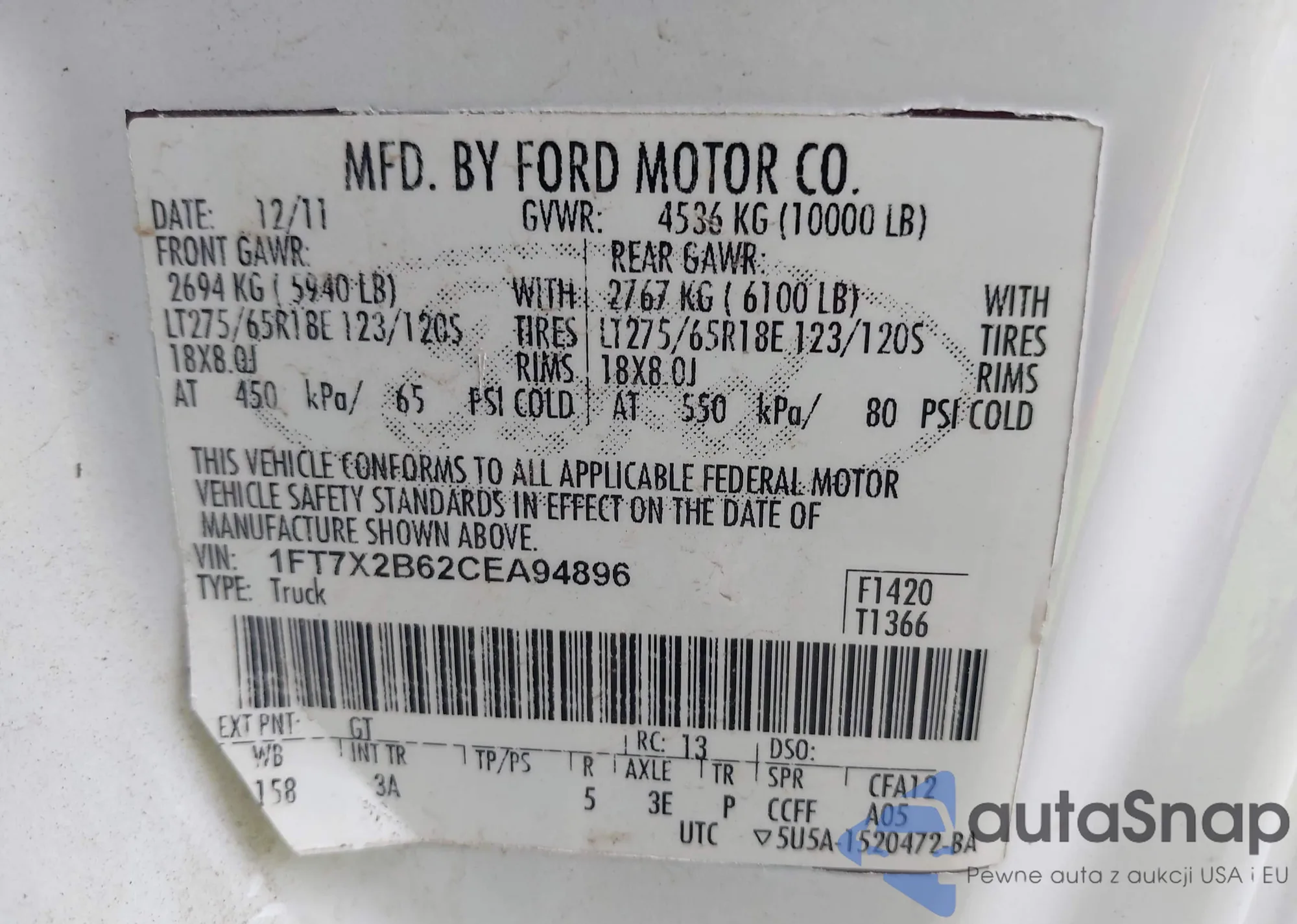LOT: 42351705 VIN: 1FT7X2B62CEA94896