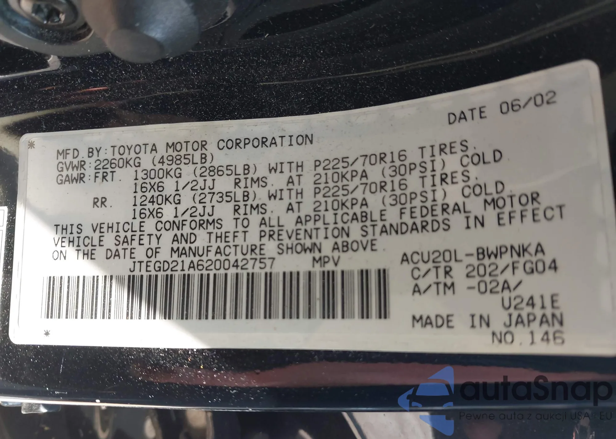 LOT: 42928903 VIN: JTEGD21A620042757