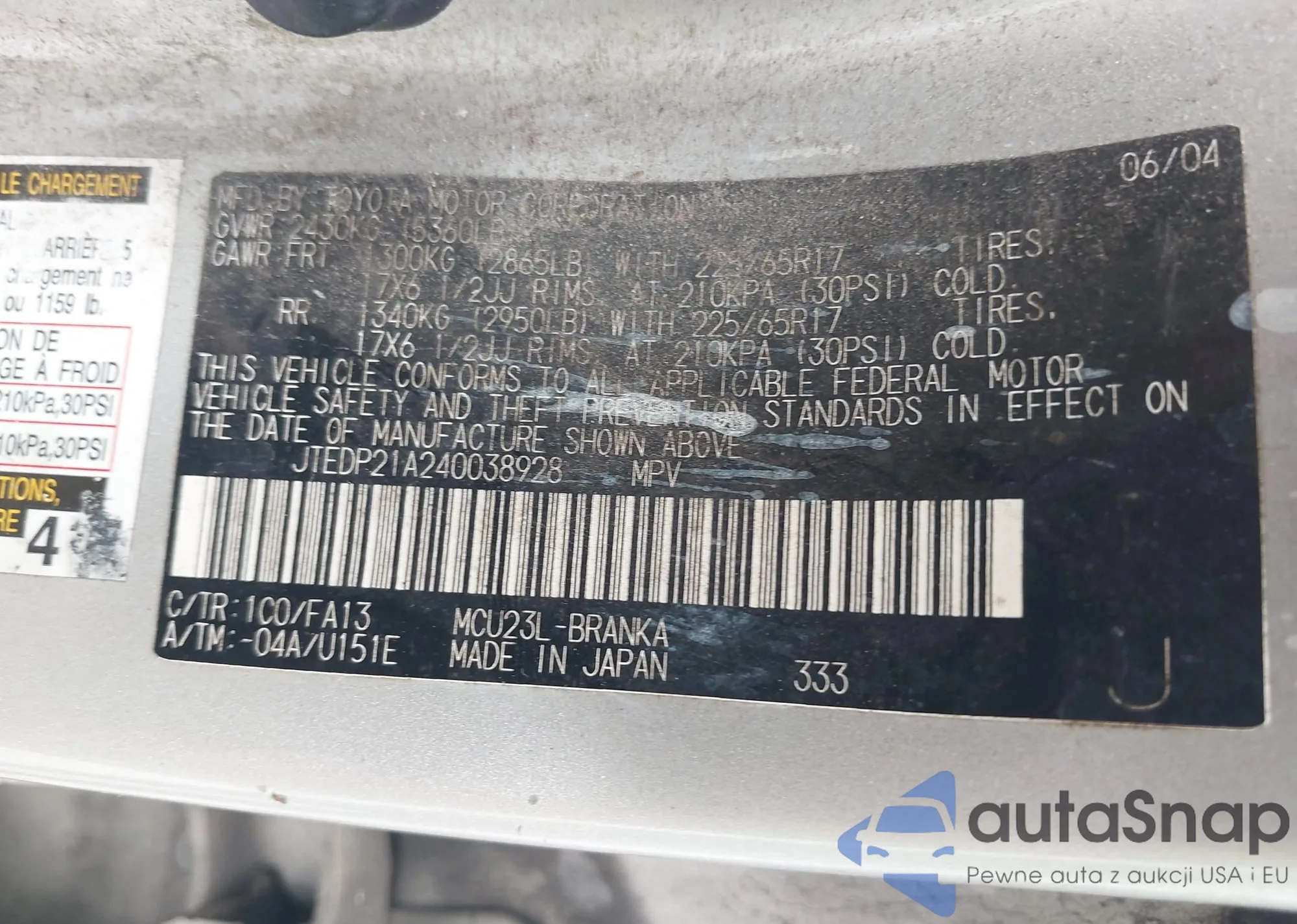 LOT: 42934252 VIN: JTEDP21A240038928