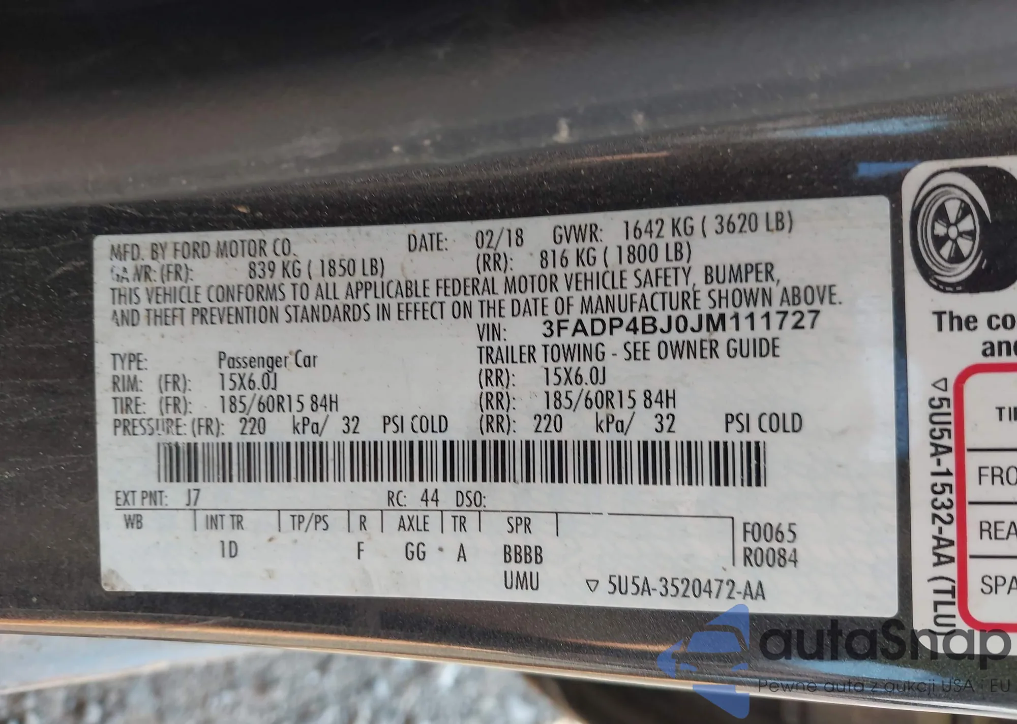 LOT: 42569746 VIN: 1FADP3M25JL242508