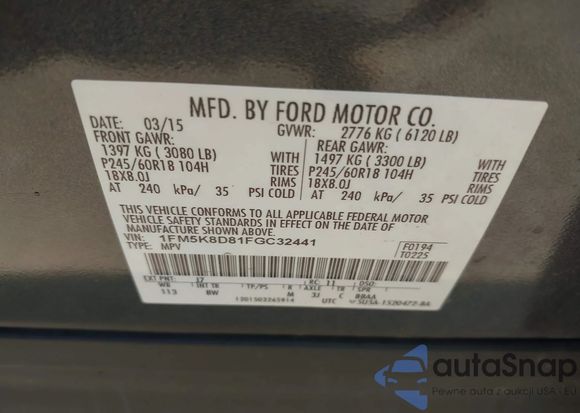LOT: 42863372 VIN: 1FM5K8D81FGC32441