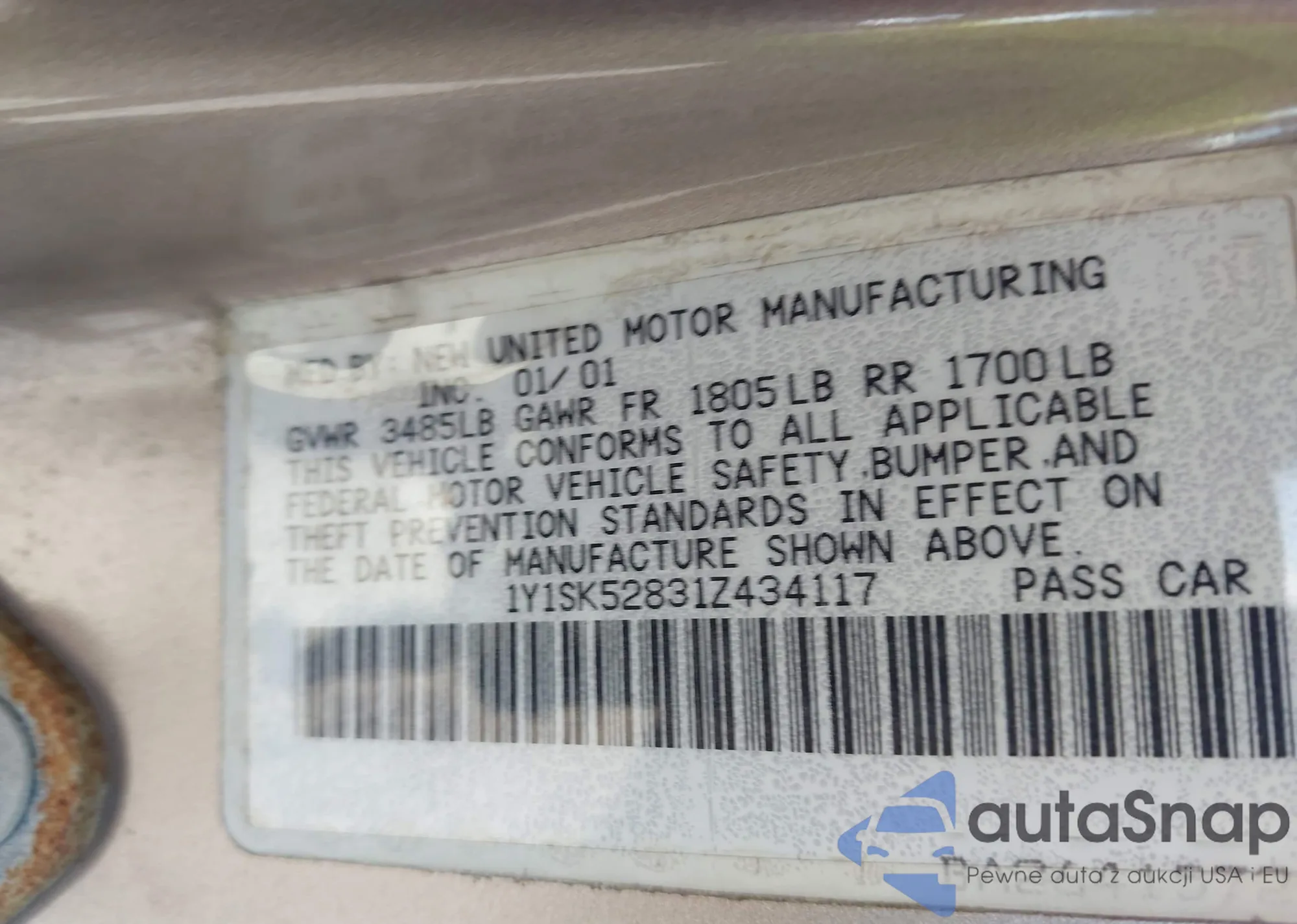 • VIN 1Y1SK52831Z434117