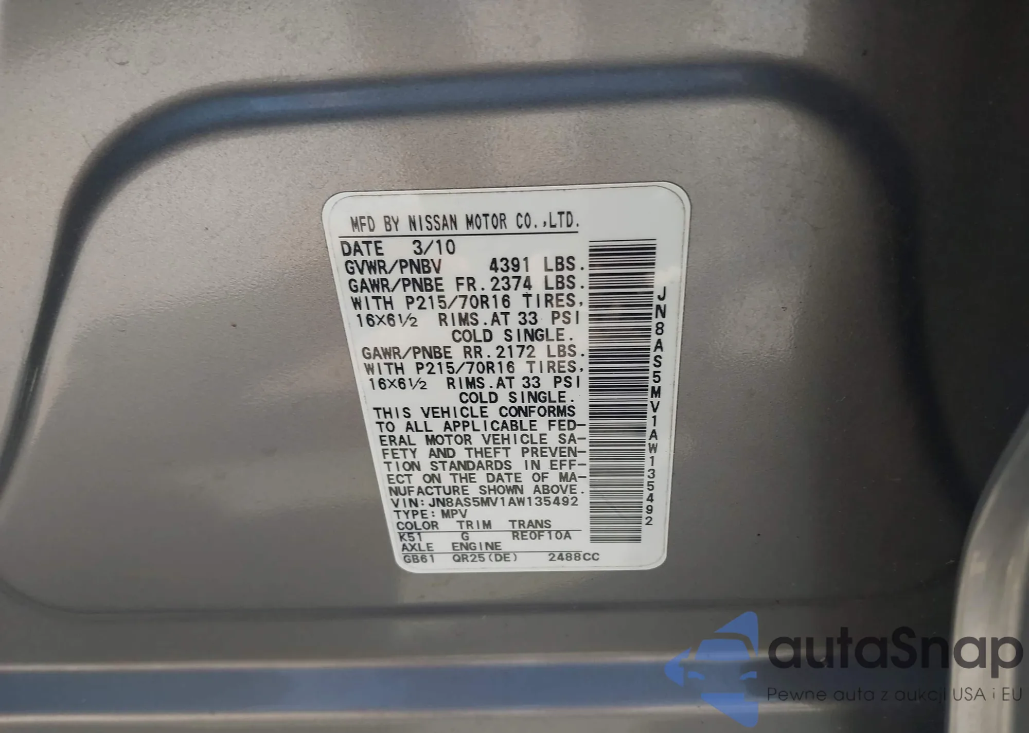 • VIN JN8AS5MV1AW135492