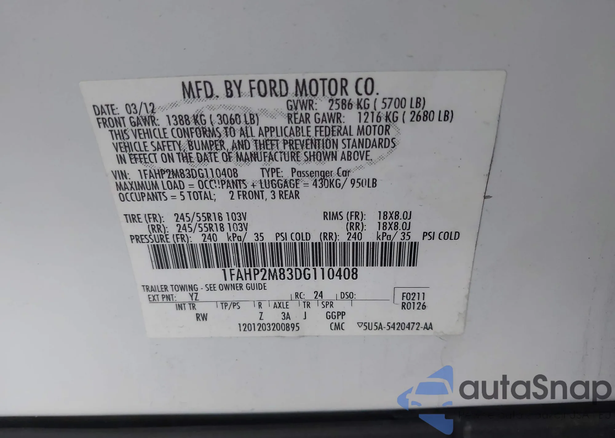 LOT: 42944216 VIN: 1FAHP2M83DG110408