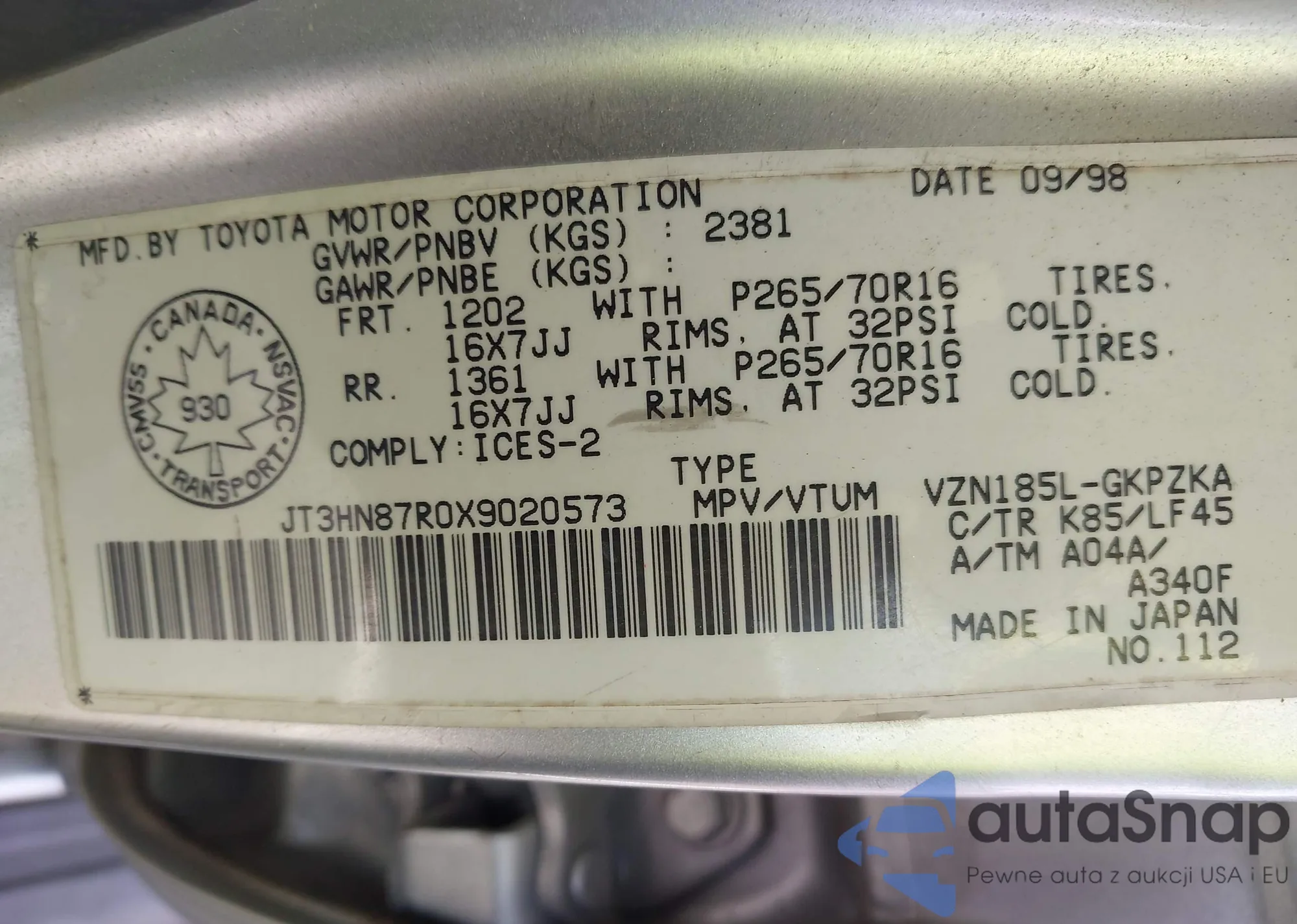 LOT: 43044311 VIN: JT3HN87R0X9020573