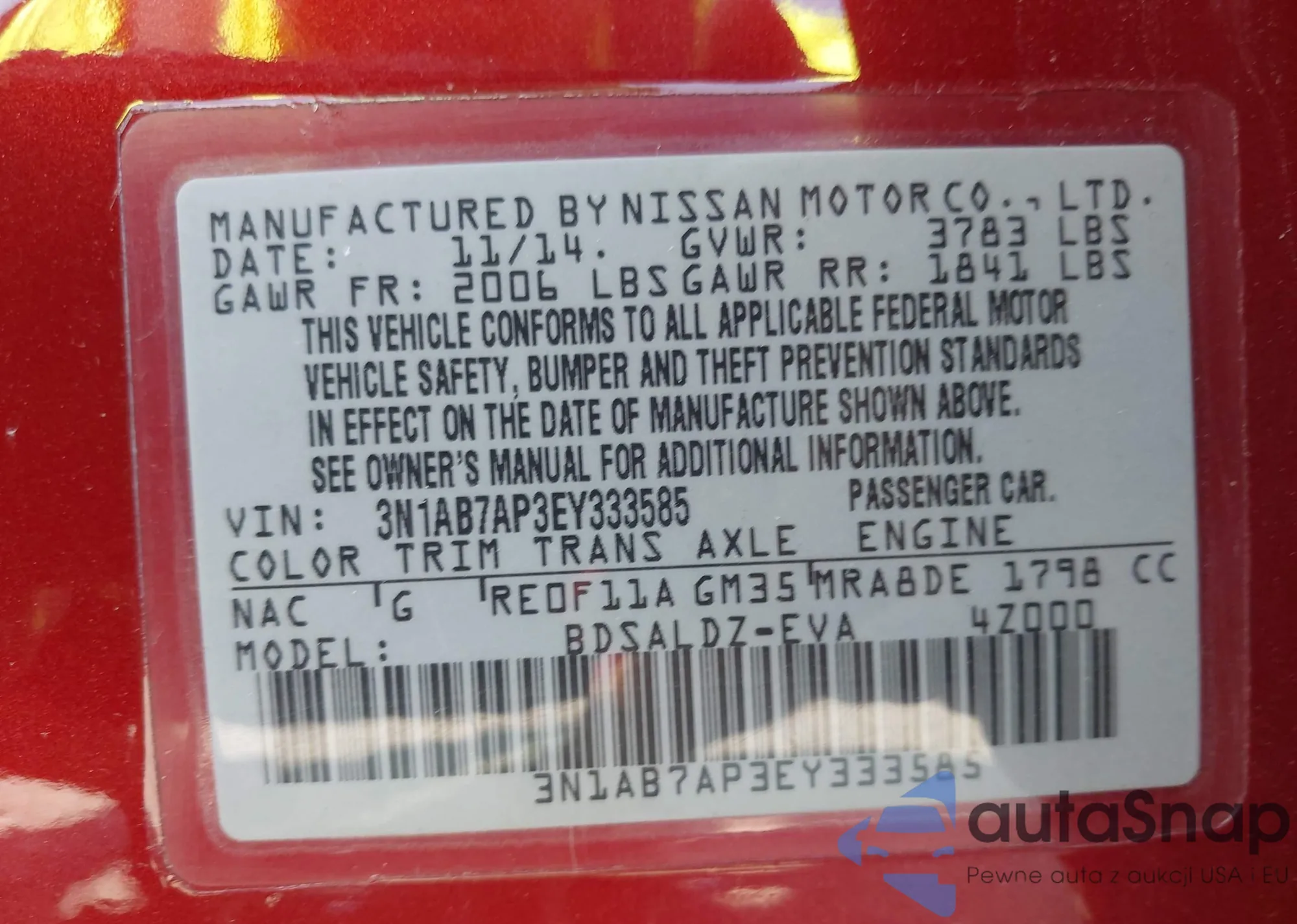 LOT: 42905913 VIN: 3N1AB7AP3EY333585