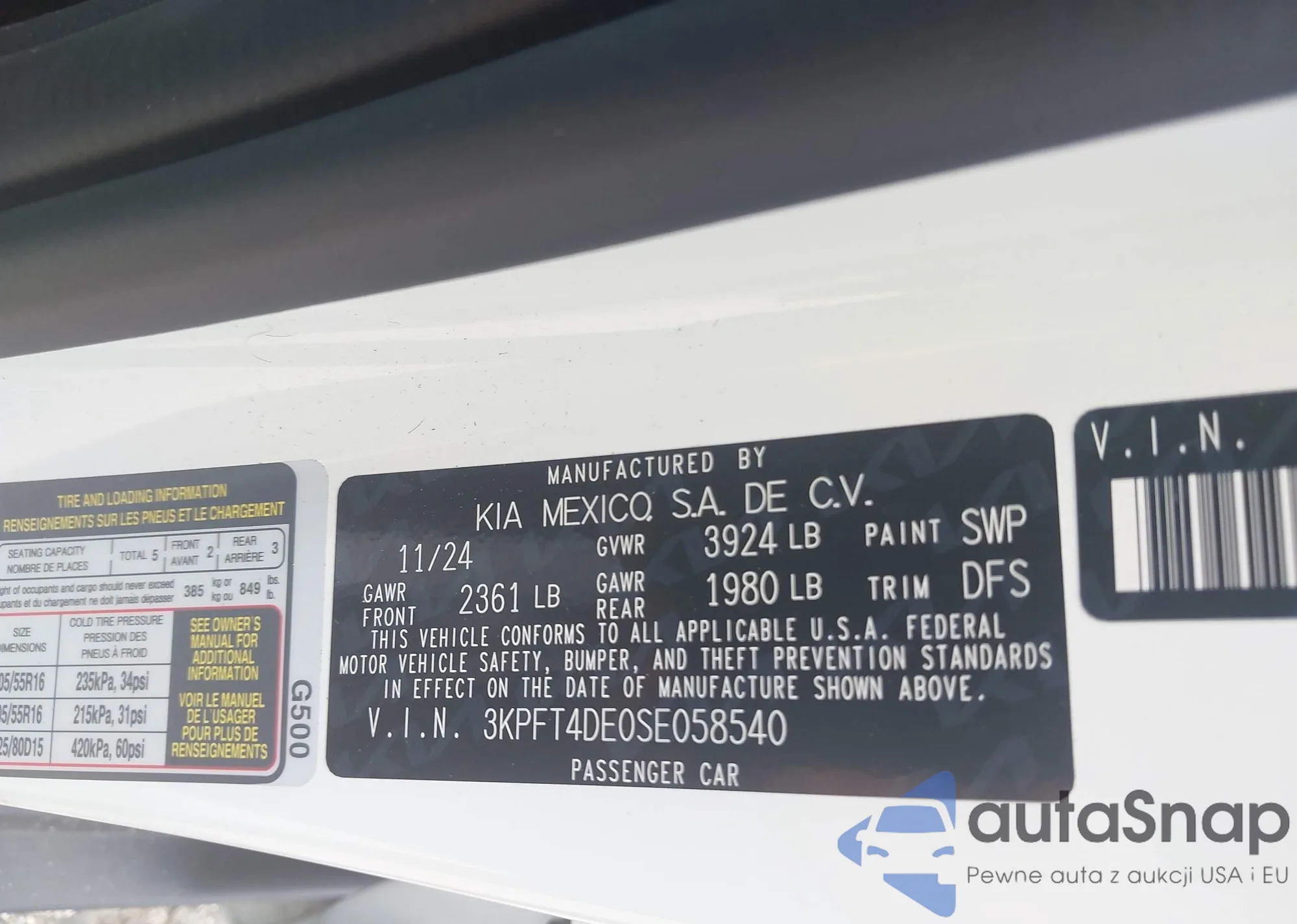 • VIN 3KPFT4DE0SE058540