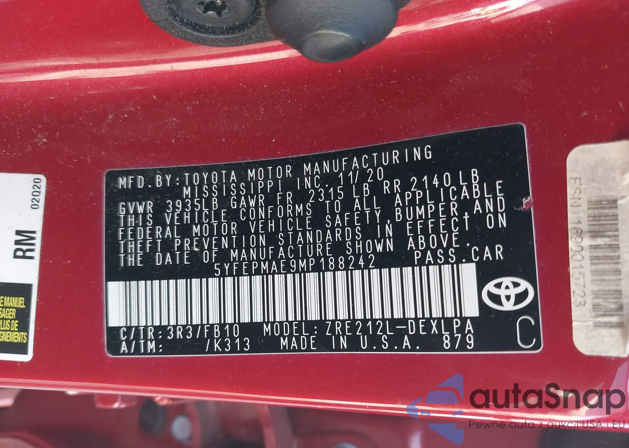 LOT: 42541465 VIN: 5YFEPMAE9MP188242